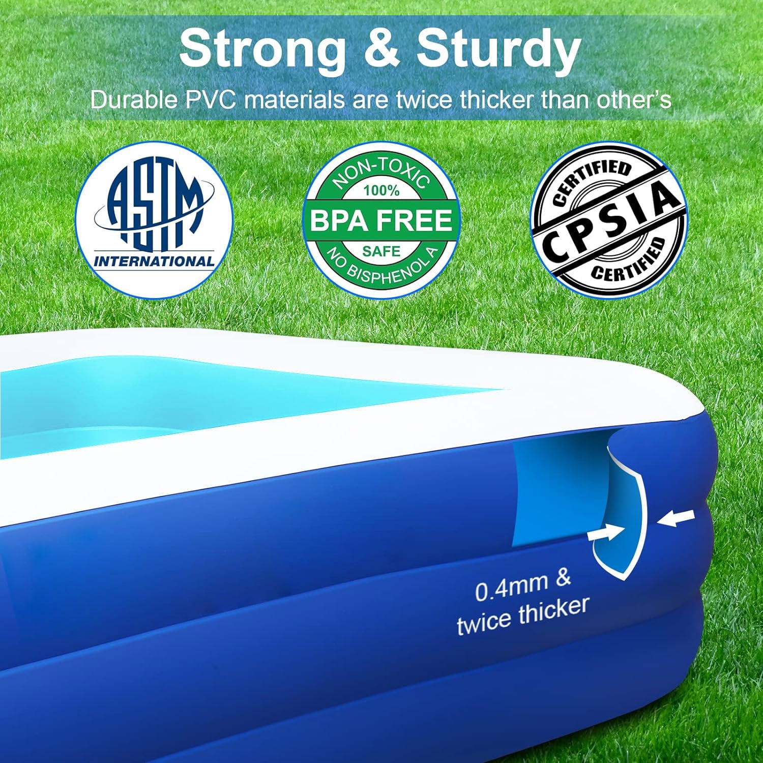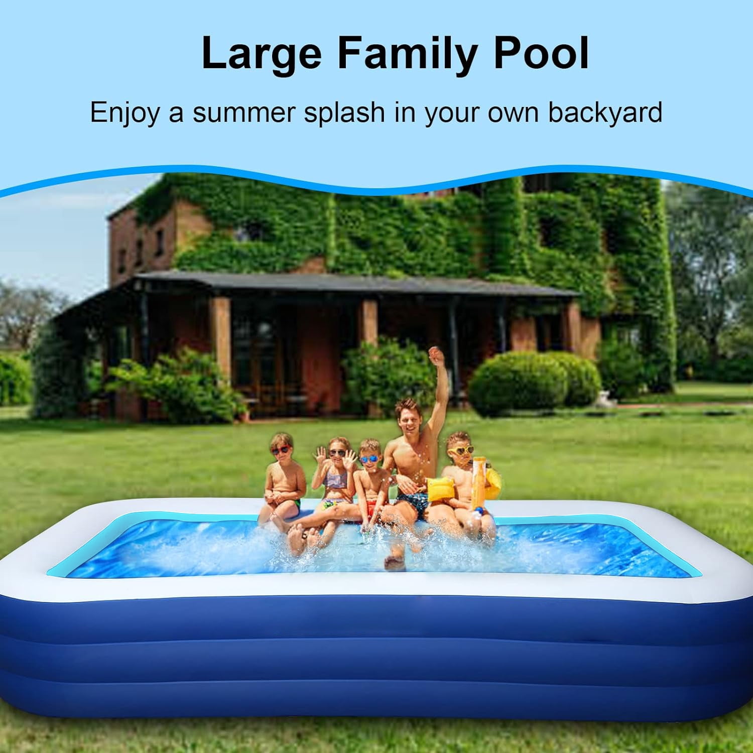 Key Features: 【Family-size Inflatable Pool】With 118″ X 68″ X 22″ size,SELLOTZ swimming pool with 312 gal water capacity can hold up to 2 adults plus 3-5 kids(Age 3+) to enjoy a splashing pool party in the backyard.This inflatable pool would be a great entertainment for your kids, pet dogs and family. 【Safe & Durable Retangular Inflatable Pool】BN-LINK swimming pool for kids is made with Phthalate and lead free, Using BPA-free materials that meets the standards of international children’s toys, which is twice thicker than most in the market, reducing the risk of punctures and ensuring a long service life. 【Quick and Easy to Use】The family inflatable pool is easy to set up, you just need to simply spread out on the ground level.The inflatable pool can be inflated in 3-4 minutes by electric pump (not included). 【Sturdy &Stable Pools for Backyard】Comes with 3 individual air chamber each, the swimming pool for adults can withstand extra weight while preventing air leakage. Drain of inflatable swimming pool can facilitate the outflow of water, tidying inflatable pool up is no longer an issue. 【Great Gift,Swimming Pool and Ball Pit】BN-LINK inflatable pool is a great gift for your kids, families, pet dogs and friends. They could not only enjoy the hot summer day time with our inflatable pool in the backyard,but also it would be used as the ball pit indoor when the weather is cool. Specifications: 1.Color: Blue 2.Weight: 13.2 lb 3.Material: PVC