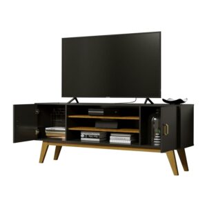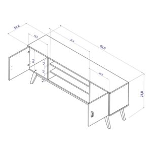 Own the highly sought-after midcentury modern look with the updated color combination of the Boahaus Atlanta Black TV Stand, taking the black matte finish and adding a high contrast look with brown shelves. This TV Stand has style and plenty of function. It will provide the storage space that you need, while also adding style to the notorious Scandinavian design. It has a lovely design and top-quality finishing touches. The amazing legs and cabinet doors are details that will truly impress you. The TV stand media console is a versatile and stylish piece of furniture. Can be used as a stand-up to a 58-inch TV. Made of Manufactured Wood. Assembly is required. Dimensions are 24.80 H x 63 W x 14.20 D.