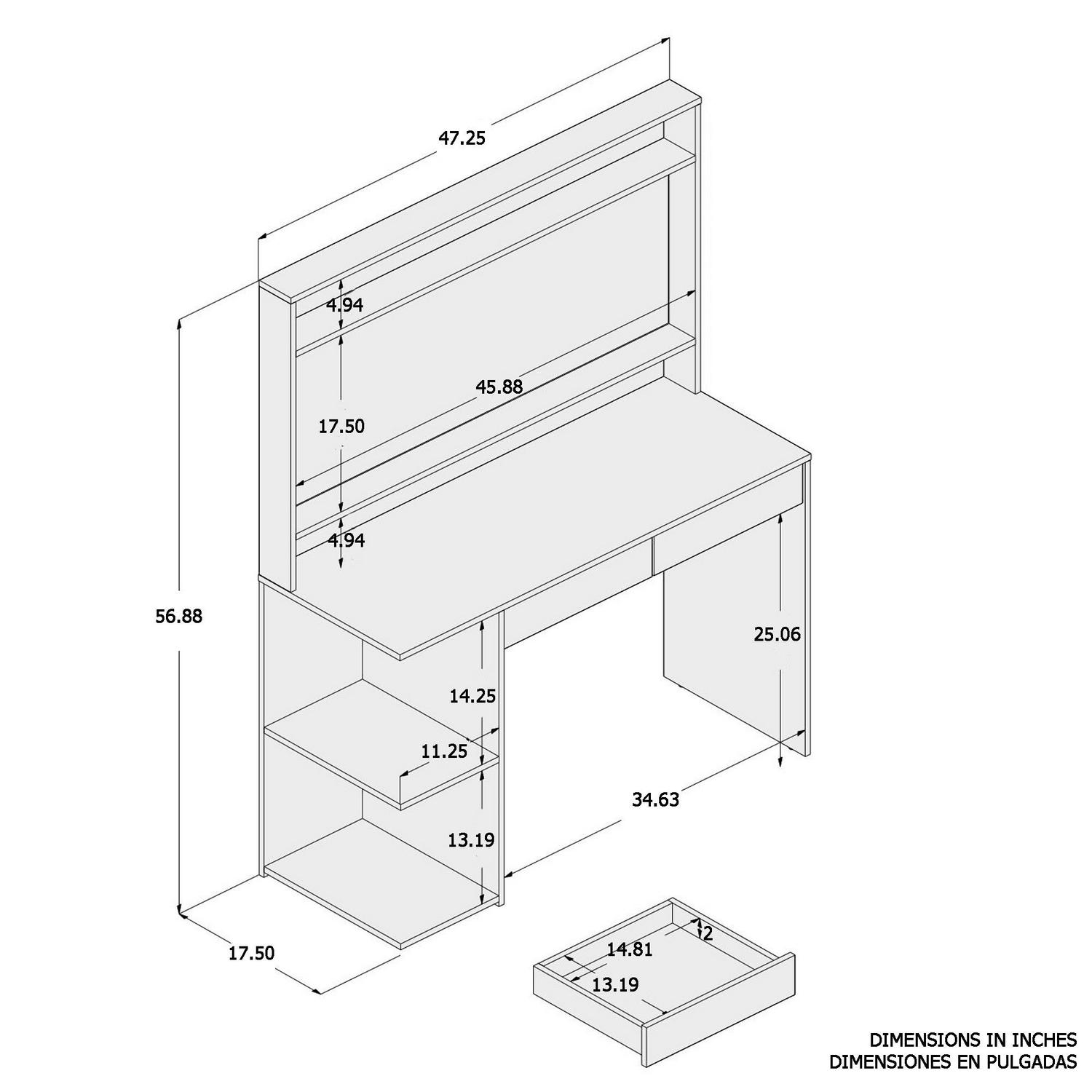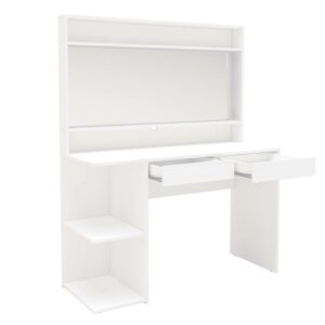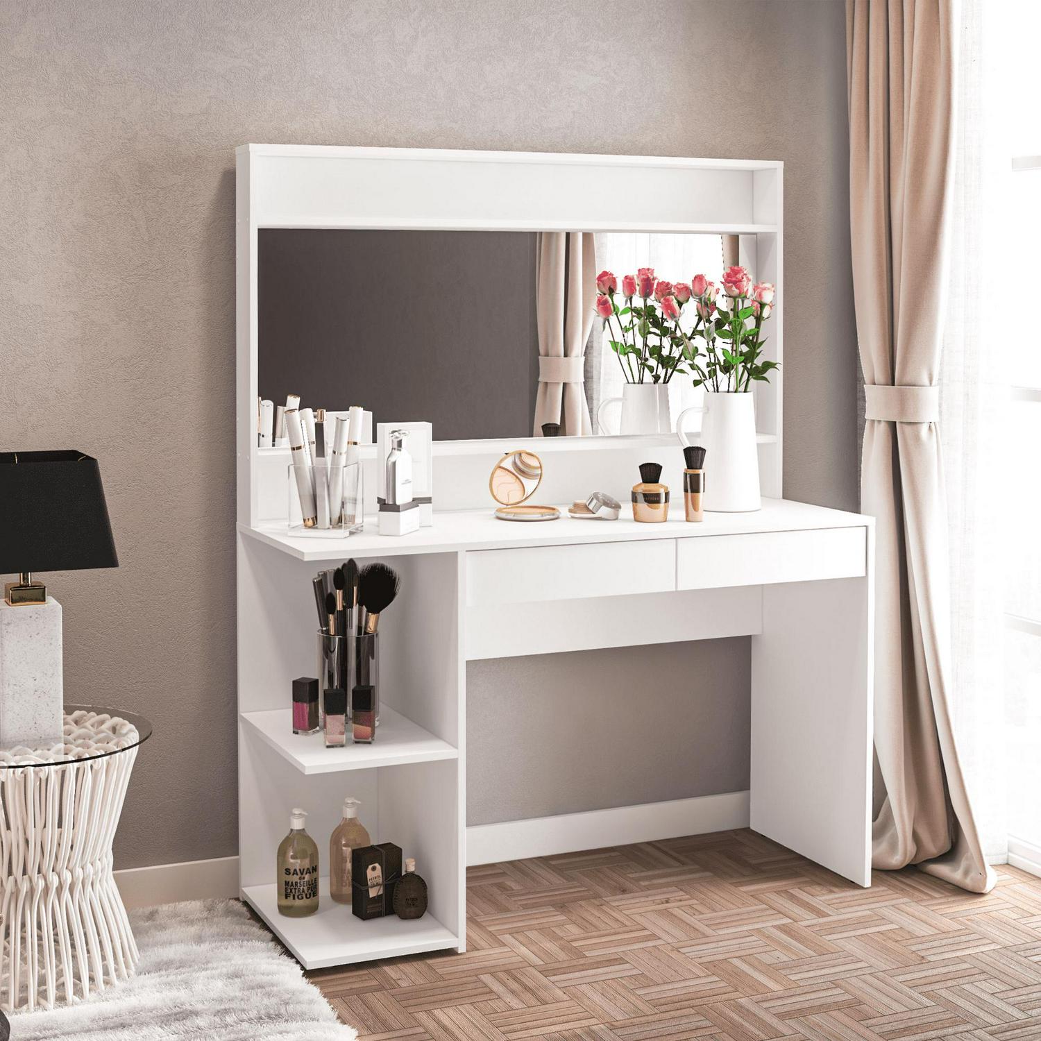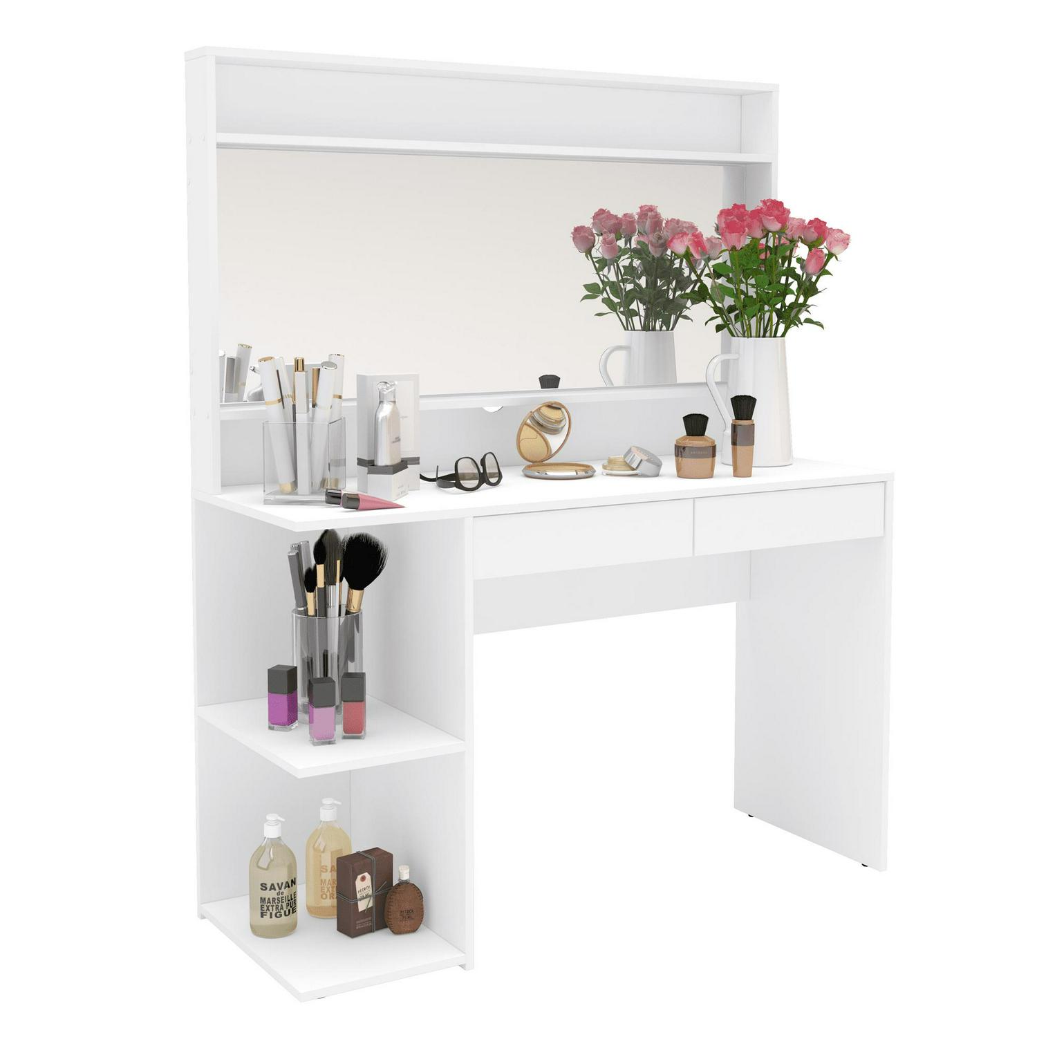 We know you love feeling elegant and stylish while you work on your makeup! That is why Boahaus brings you the perfect Vanity Table. This Vanity is made of high-quality material and it is engineered to make the vanity table stable and durable. It has two well-sized drawers, which can help you organize costume jewelry and cosmetics. It features two side shelves for ample storage space. These two shelves are designed to place your daily shoes, purses, or a floral décor to give the desired ambient to your room. The Berenice Vanity Table is a modern vanity with a beautiful well-sized mirror. The elegant white finish will perfectly match your other furniture and give the desired décor to your room. It also features a wide shelf over the mirror to place any decorative gadget. Assembly is required. This beautiful vanity measures 56.88 H x 47.25 W x 17.50 D.