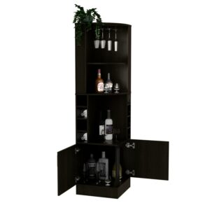 Stand out from the rest with the Boahaus Birmingham Bar Cabinet. Fitting neatly into a corner, this fashionable piece of furniture can store some liquor bottles. The built-in stemware rack allows you to hang four wine or cocktail glasses. Eight cubbies (4,4”H X 4,4”W) line the unit, four on each side. Premium display space in the center for spirits is sure to catch the eye of any guests. Two large cabinet spaces at the base of the unit are perfect for storing liquor, cocktail books, or decorative accents in view but out of the way. With an ideal size (18,4”W X 18,4”D X 71,1”H)and unique design of black manufactured wood finish.