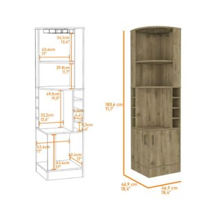 Suppose you are looking for a bar cabinet with a unique, memorable, ergonomic design, where you can store drinks of different sizes and in different positions. In that case, you are in the perfect place. Thanks to its open shelves, we can decorate the space while storing. It has cavities to keep glasses, and its elegant and modern design gives a touch of elegance and originality in homes and creates a festive atmosphere and comfort to serve appetizers. The Birmingham bar cabinet is a piece of furniture designed for the best functionality possible; the first thing you will notice is the corner cabinet design, which perfectly fitting to fit most spaces; two top shelves are a great feature to display decorative items or put your open bottles while you entertain your guest. You will find four-bottle cubbies made for standard-size bottles and a central open shelf on each side. A bottom two-door cabinet will allow you to conceal those large items you want lying around and assist you with a vast space to store them. With dimensions 71 High x 18.4 Wide x 18.4 Deep, It is made of particle-board in macadamia finish.