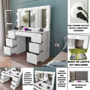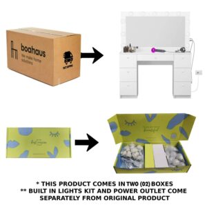“Introducing Freya, the ultimate makeup vanity desk for every makeup enthusiast. Created by the renowned brand Boahaus, this wide makeup mirror is designed to elevate your beauty routine to the next level. With its sleek and modern design, Freya is the perfect addition to any bedroom or makeup studio. Crafted with precision, this big vanity desk features a spacious tabletop surface that provides ample space to display and organize your makeup essentials. The 7 drawers offer convenient storage for all your beauty products, keeping them within easy reach. The White vanity adds a touch of elegance to your space, creating a sophisticated and glamorous atmosphere. Unlike other vanities, Freya comes with a non – glass top vanity, ensuring durability and safety for everyday use. With our selection of unique and stylish knobs to add a touch of elegance to your bedroom. The vanity light provides perfect illumination, making it easier to achieve flawless makeup looks every time. Freya is not only functional but also designed with your needs in mind. It is specifically tailored for women and makeup artists who require a dedicated space to unleash their creativity. The vanity’s sleek and spacious design allows you to comfortably work on your makeup, with all your tools and products at your fingertips. Whether you are a professional makeup artist or simply enjoy experimenting with different looks, Freya is the ultimate makeup vanity desk for you. Its storage space, wide makeup mirror, and stylish design make it a versatile and essential piece of furniture for any beauty enthusiast. It’s worth mentioning that this vanity mirror with lights desk is shipped in three separate boxes to ensure that each component arrives in perfect condition. Don’t miss out on the opportunity to own this exceptional vanity. Get Freya today and transform your beauty routine into a luxurious and effortless experience. Order now and unleash your inner artist with Freya! ” Dimensions are 56,13″ H x 46,44″ W x 15,44″ D