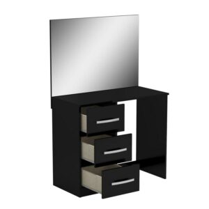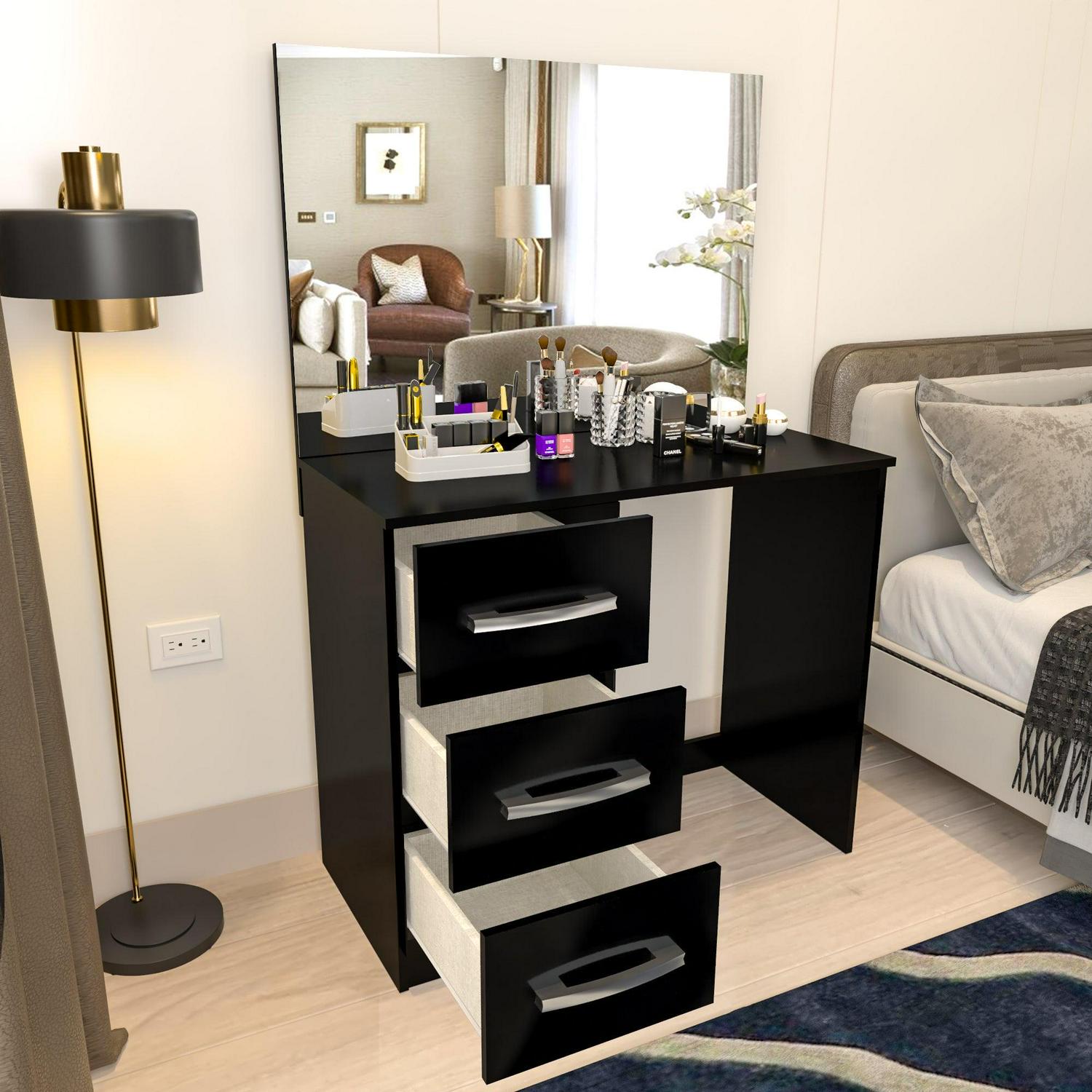 Boahaus Kira Modern Makeup Vanity Table with 3 Drawers, Wide Mirror, Black Painted, for Bedroom