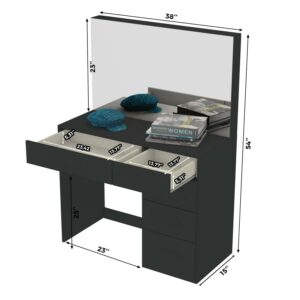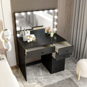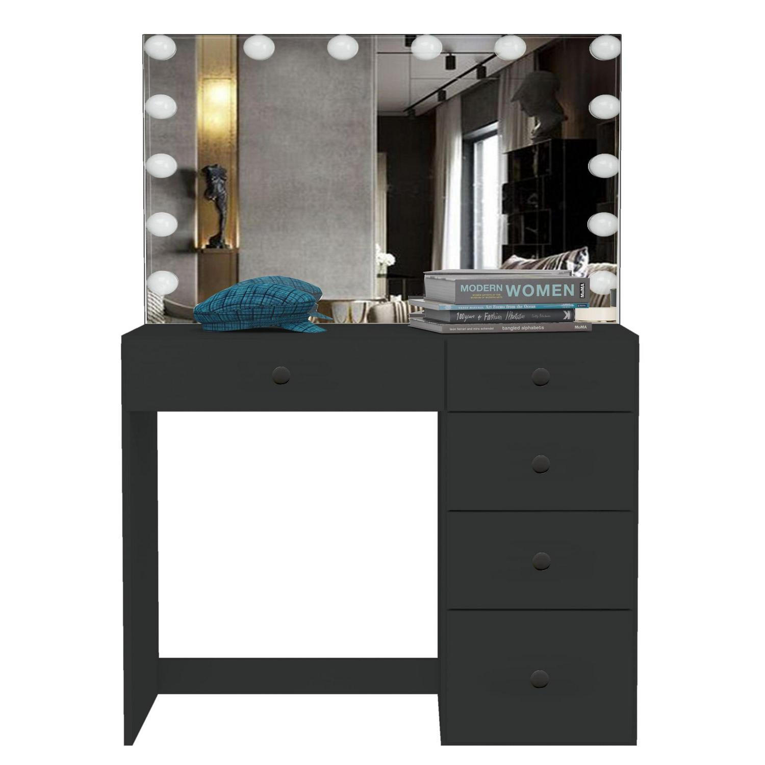 Boahaus Saranya Makeup Vanity Table with 5 Drawers, Light Bulbs, Standing Mirror, Black
