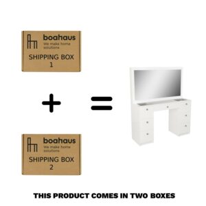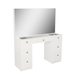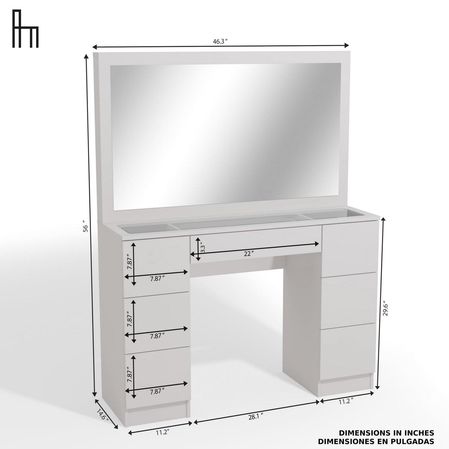 Everyone dreams of having the perfect makeup desk with drawers and mirror light, but we all know how hard it can be to find the right one. So, if you are looking for a white vanity table with mirror for dresser and a modern style, Boahaus brings you the answer. Make your dreams come true with the Venus Vanity Table. With the full-width Hollywood vanity mirror, you can try every outfit and get the best makeup. Made from manufactured wood, this modern and unique piece features a finish that matches almost every room’s decor. It highlights a large central drawer where you can place your jewelry pieces and makeup gadgets. The glass top base of the bedroom vanity with mirror and drawers makes your everyday gadget visible at the time of makeup. It gives a spectacular look and it is well robust to place objects like your laptop. In addition, it has other six drawers with crystal knobs of the same size where you can store everything you need for your daily routine. Assembly is Required. Dimensions are 56 H x 46,3 W x 14,6 D.