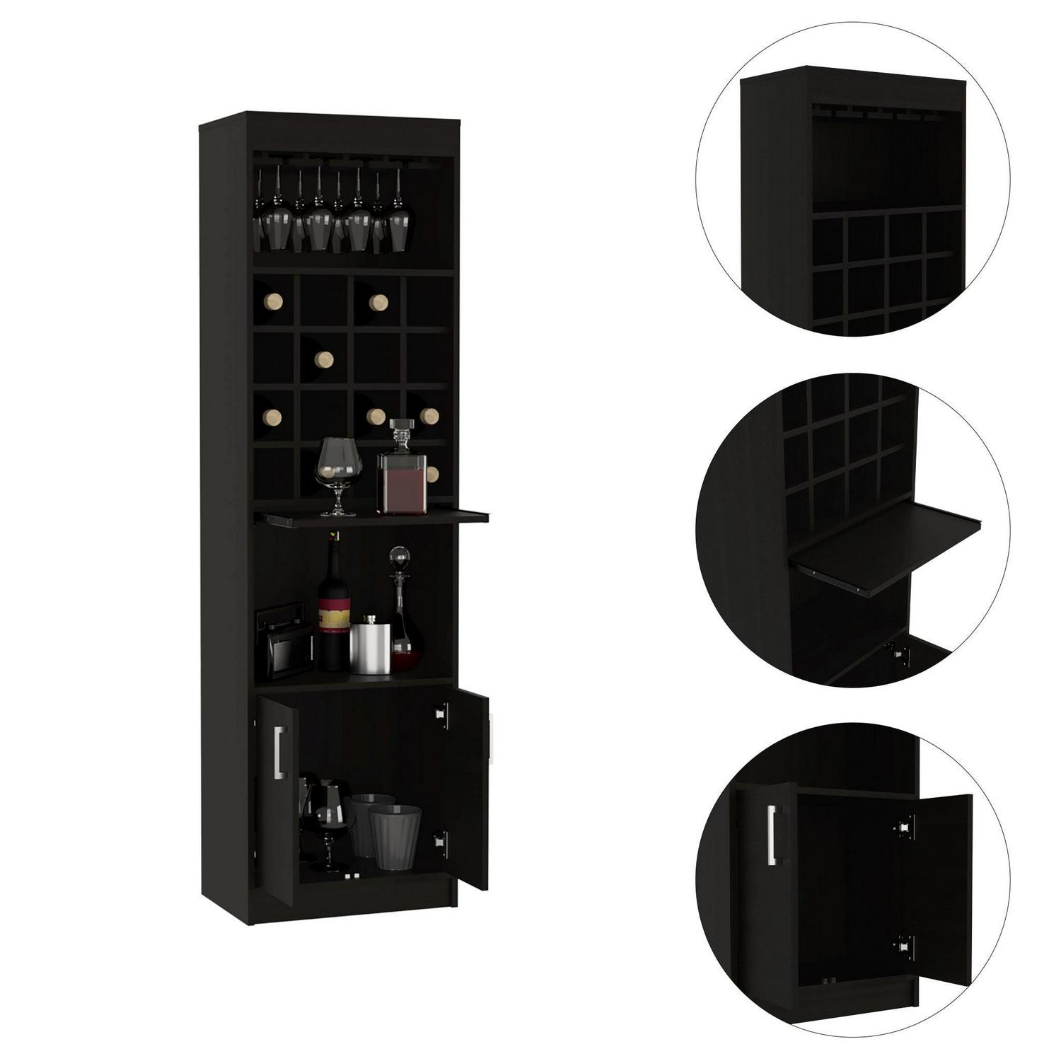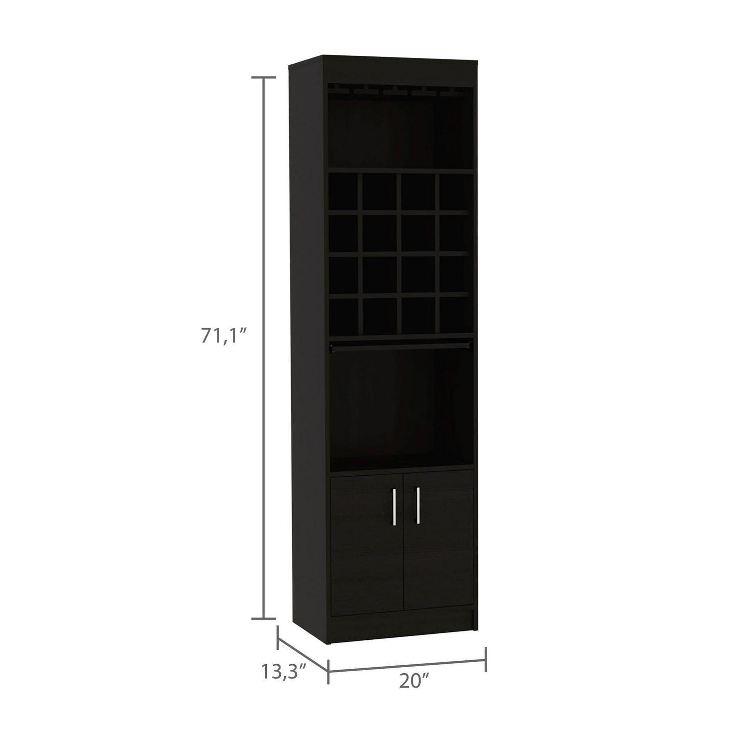The Boahaus Wells Modern Bar (Black) has you covered when it comes to entertainment. A stylish design combined with a dark volcano finish will impress your guests. It comes with a glass rack, 16 cubbies for wine or liquor, a large open area below that’s perfect for displaying your favorite spirits, and an underneath cabinet space that gives you all the storage you might need to keep any gathering going. It features a very convenient and concealable serving table that will help you prepare and serve your drinks, cocktails, and spirits on the spot. Product dimensions are: 71.1in Hx 20in Wx 12.7In D