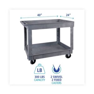 Durable resin construction, gray, two-shelf utility cart with casters. Molded-in plastic handle allows for easy steering on the go. The handle and raised top rim are great for hanging cleaning products and supplies to tackle cleaning jobs from one room to the next. Convenient swivel casters allow multi-directional travel around tight corners. Two fixed shelves provide sturdy storage for all your janitorial supplies.