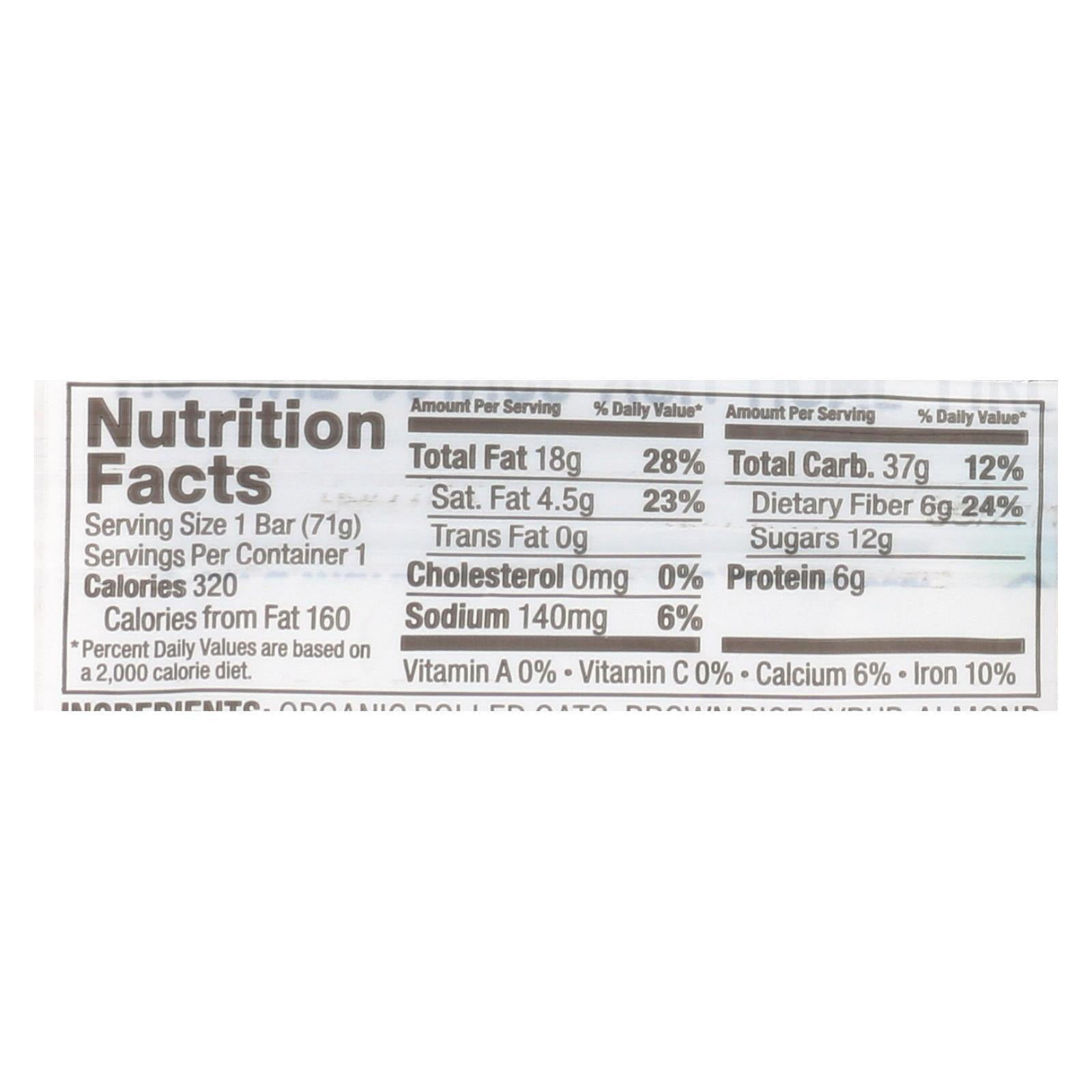 Details: BOBOS OAT BARS COCONUT ALMOND BUTTER FILLED BARS ARE STUFFED WITH A SMOOTH ALMOND NUT BUTTER MAKING IT EASY TO UNDERSTAND WHY IT IS A CUSTOMER FAVORITE. ORGANIC COCONUT AND ROLLED OATS SURROUND THE CREAMY CENTER MAKING IT AND EXPERIENCE YOUR TASTE BUDS WILL ENJOY. BOBOS OAT BARS ARE MADE FROM SIMPLE WHOLESOME INGREDIENTS AND PROVIDE AN EXCELLENT SOURCE OF PROTEIN AND FIBER TO JUMPSTART YOUR DAY. EAT THEM FOR BREAKFAST OR TAKE ONE WITH YOU FOR AN AFTERNOON SNACK. OUR COCONUT ALMOND BUTTER FILLED BARS ARE GLUTEN FREE, VEGAN, NON-GMO, AND SOY FREE. INCLUDES 12 2.5 OZ BARS. SEE NUTRITION FACTS PANEL FOR ALLERGENS. BOBOS STARTED ON A RAINY AFTERNOON WHILE A MOTHER AND DAUGHTER MADE OAT BARS IN THEIR HOME, VERY LITTLE HAS CHANGED SINCE THEN. WE STILL PROMISE THE SAME QUALITY, WHOLESOME INGREDIENTS THROUGH OUR SIMPLE BAKING PROCESS, THERE ARE JUST A FEW MORE PANS IN OUR KITCHEN. Ingredients: ORGANIC WHOLE GRAIN ROLLED OATS;DRY ROASTED ALMONDS;BROWN RICE SYRUP;ORGANIC CANE SUGAR;ORGANIC COCONUT OIL;ORGANIC DRIED COCONUT;OAT FIBER;VEGETABLE GLYCERIN;SALT;XANTHAN GUM;NATURAL FLAVORS;VITAMIN E;FOR FRESHNESS