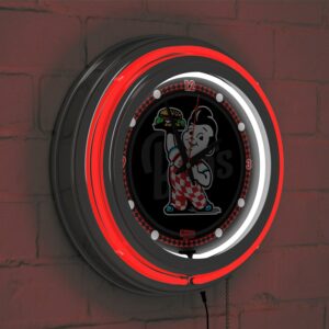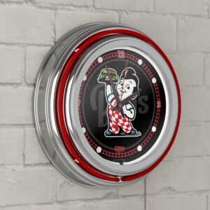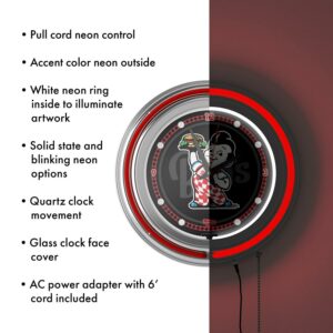 This officially licensed Neon Wall Clock is the perfect addition to any game room, garage or man cave. This impressive clock has two neon rings; one is an accent colored neon ring on the exterior and the other is a brilliant white neon ring on the interior of the clock to light up your favorite logo. Other highlights include chrome finished resin housing and a high-grade glass clock face cover. The battery-operated quartz clock mechanism will keep it ticking for a long time, while the neon runs off the included AC adapter. The neon is controlled by the pull chain and the back of the clock includes a wall hanging mount and has two modes solid state and blinking. The 3 depth of this clock combined with the radiant shimmer of the neon reflecting off the chrome housing is sure to make this clock pop on any wall!