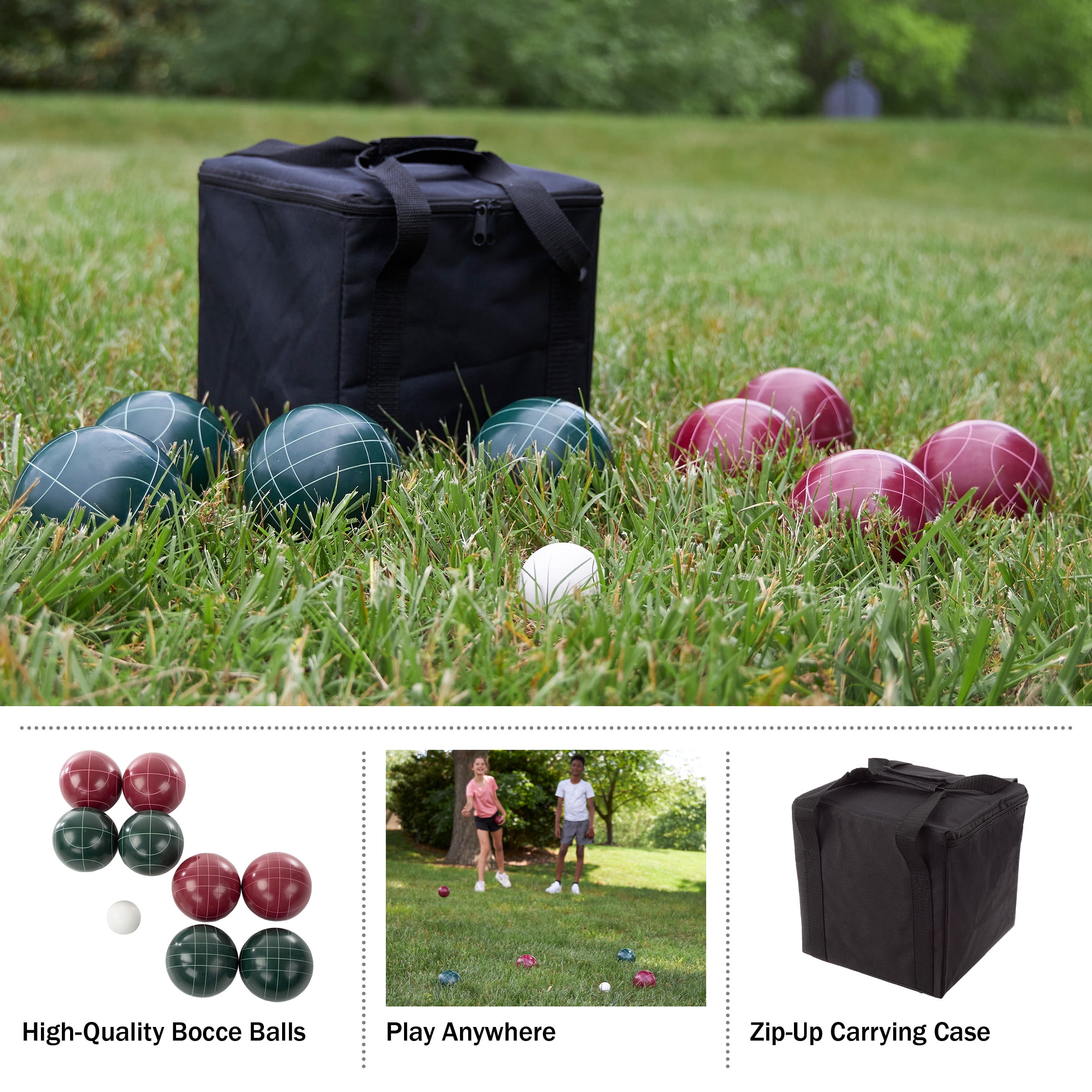 BOCCE BALL GAME SET – This classic bocce or petanque game set is great for outdoor yard games and includes 4 green and 4 red bocce balls to represent two teams for tournament-style play or just for hours of ball game fun. QUALITY MATERIAL – The 8 bocce balls are made with a high-quality polyresin compound material that resists cracking and damage for long-lasting fun, ideal for outdoor lawn games or beach games. A pallino is also included. PLAY ANYWHERE – This lawn bocce ball set is one of the most classic backyard games for adults and family. Take it with you to the park, beach, barbecue parties, campgrounds, or your neighbor’s yard for some friendly bocce or petanque game competition. CARRYING CASE INCLUDED – The bocce accessories conveniently fit inside the included black carrier case with handles for easy storage and transport to outdoor activities, such as beach games for adults and families. PRODUCT DETAILS – Materials: Polyresin Composite. Dimensions: Bocce Ball: (L) 3.93″; Pallino Ball: (L) 1.5″; Carry Case: (L) 8″ x (W) 8″ x (H) 8″. Bocce Ball Court Kit Includes 8 Balls, 1 Pallino, and Carrying Case. Color: Red and Green.