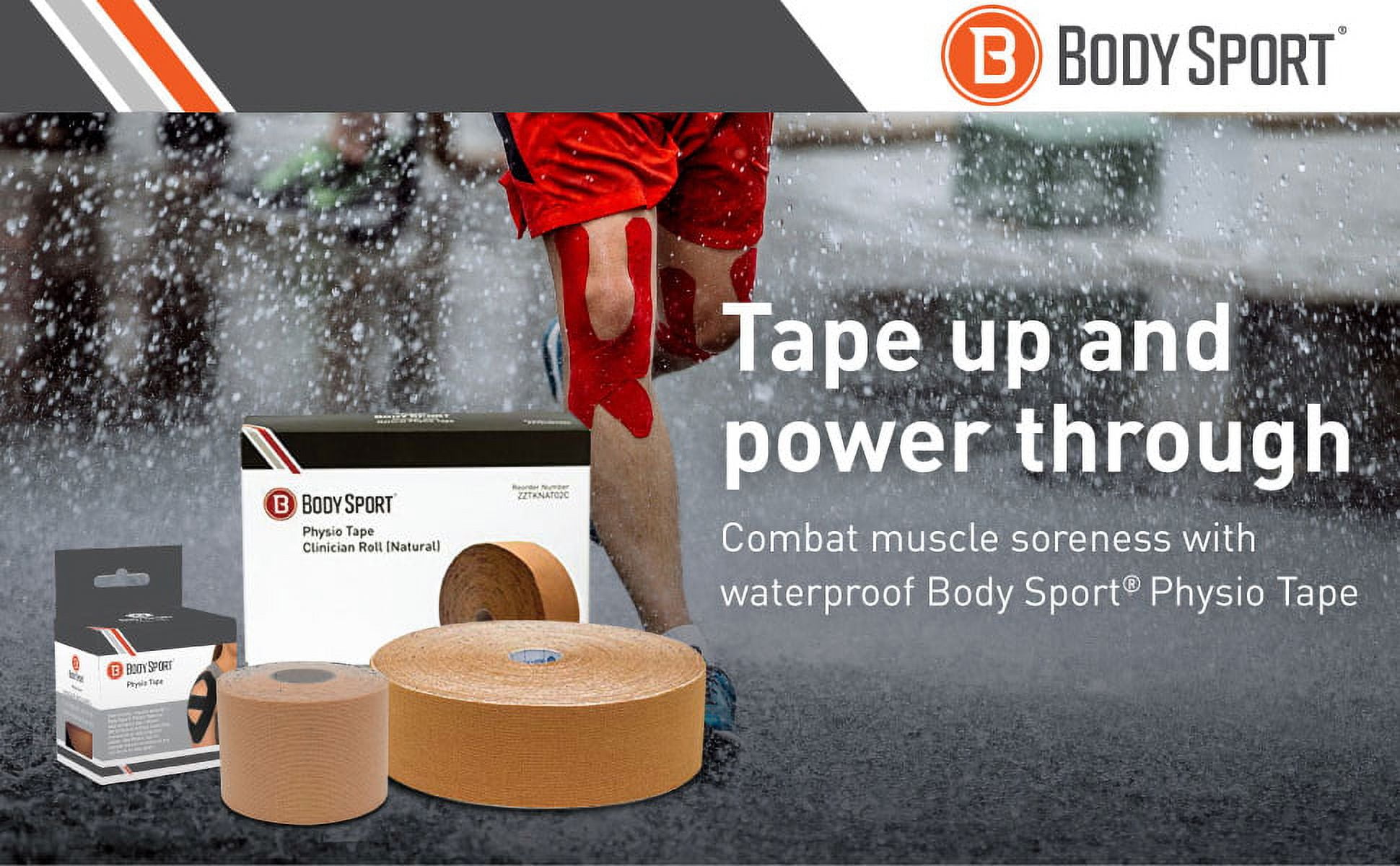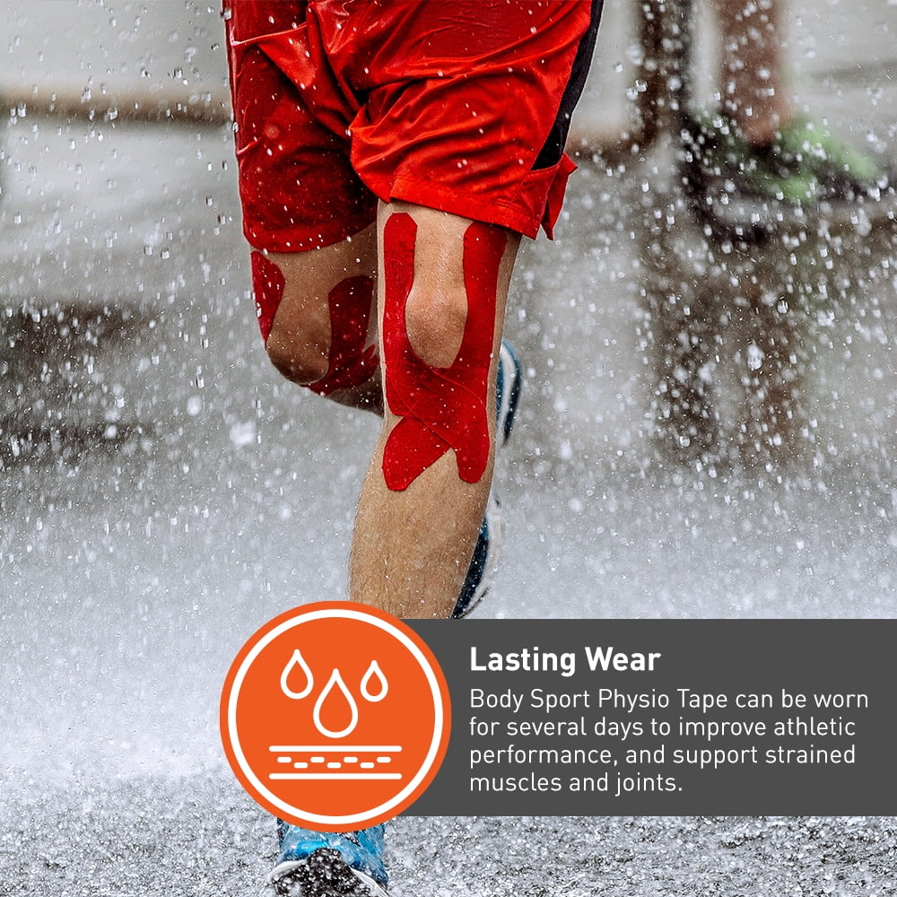 The Body Sport Physio Tape can be applied over and around the muscles to improve function during training or post-workout. This durable, yet soft tape is water resistant and can be worn for several days without reapplication. It is designed to provide users with lasting support for sprained or strained muscles and joints. With this best-in-value tape, you can support a full range of motion when you need it most