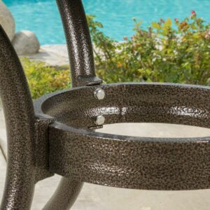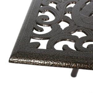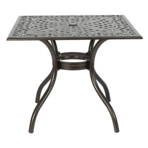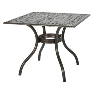This Bogota Cast Aluminum Patio Table with Hammered Bronze Finish is just what your patio, porch, or poolside needs. This square beauty offers room at the table for four people. It’s well-crafted of cast aluminum and boasts a versatile hammered bronze finish. The table includes a handy umbrella hole, making it ideal for all-day affairs. Curving legs and a stylish support ring complete the look.