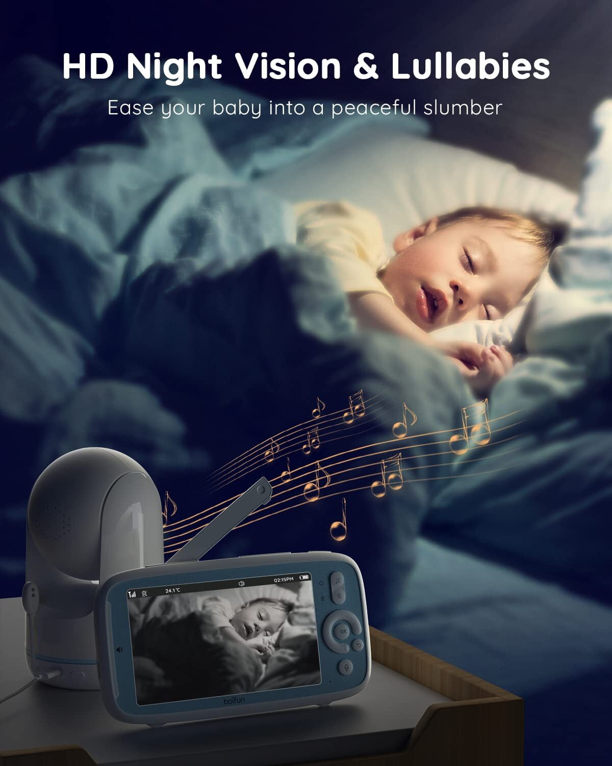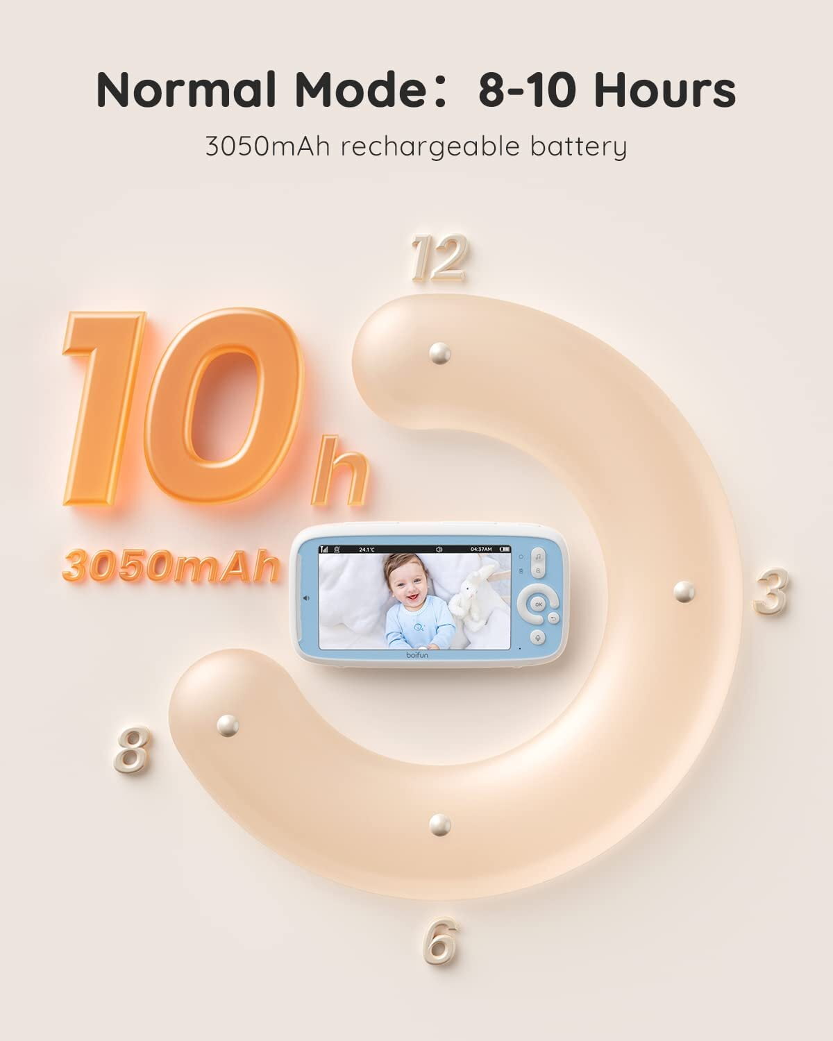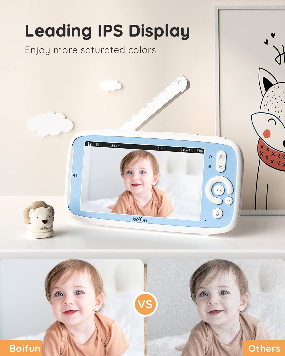 Free your mobile phone, leave the task of monitoring to a separate display ??️【720P 5” HD Screen & Night Vision】 BOIFUN video baby monitor is equipped with a large 5-inch screen with 720P resolution and a high-performance CMOS sensor. You can take care of your baby through a separate video baby monitor instead of your phone. The color is saturated during the day and the image is clear during the night. Create a safe environment for your baby ??【Encrypted Secure & Long Range Signal Coverage】 Using the latest 2.4GHZ FHSS transmission technology (no WiFi required), this wireless baby monitor with camera keeps the privacy of your baby protected from hackers. The video baby monitor supports connecting to 2 cameras at the same time and up to 500m long range connection, allowing you to happily cook downstairs, enjoy the sun by the pool. ??【PTZ & 3 x Zoom & Foldable Bracket】 The video baby monitor with remote pan-tilt-zoom supports 330° horizontal and 135° vertical rotation. Cooperating with a foldable bracket, you can freely rotate the baby camera to follow every step of your baby. And 3x zoom function of the baby monitor with camera allows you to get an up-close look at your baby’s every tiny expression – from the sweetest smile to the most infectious giggle. Prepare adequately for your baby’s diverse needs ??【VOX Mode & 3050mAh battery & Two-way Talk】 The BOIFUN video baby monitor comes with a 3050mAh large-capacity battery, which works for 8–10 hours in constant light mode and 16h in VOX mode. The screen of the video baby monitor will sleep to save power in VOX mode. Once your baby makes a noise, the screen will automatically wake up. You can judge the situation by sound level indicator and soothe your little one through two-way talk. Many times babies just need to hear your voice and know that you are right next to them. ????????【Intelligent Helper】 Smart baby monitor also supports lullabies, feeding reminder and temperature detection. Whether the baby is hungry, sleepy or cold, BOIFUN video baby monitor can provide you with corresponding countermeasures or tips. ??【Better Service – 90-Day Hassle-Free Return and Three-Year Warranty】 BOIFUN’s customer service team is always ready to provide personalized, high-quality service. We’ve served over one million families worldwide with our high-quality products over the past 8 years.