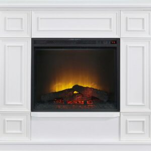 Heat up your home with this Bold Flame 43.31″ Electric Fireplace Heater. It uses fan force to produce 4600 BTU to keep the room warm and comfortable. This freestanding fireplace heater comes in a neutral white color that blends more easily with most walls. It features an LED flame effect that can function with or without heat. This heater has five different settings for flame and ember bed brightness settings. It uses simple push-button controls with an easy-to-read LED readout. The white electric fireplace has a child protection lock.