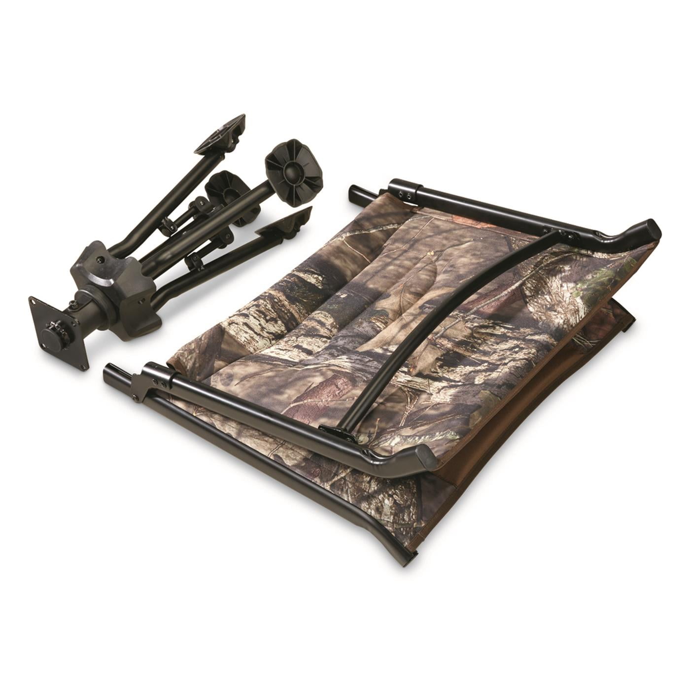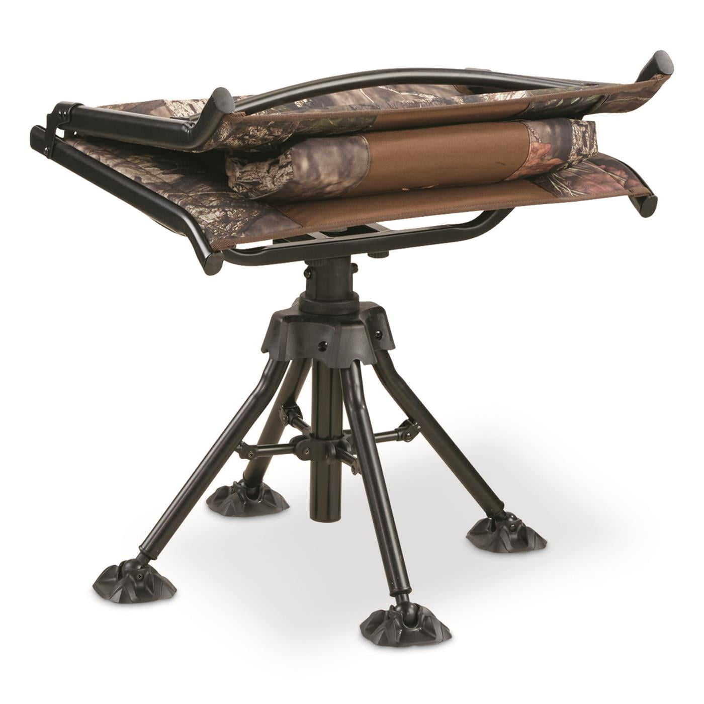 Silently swivels 360° Extra padding on seat and lumbar area Sliding headrest/lumbar pad Powder-coated frame Large, fully articulated swivel feet Mossy Oak Break-Up® COUNTRY™ camo 300-lb. weight capacity 14.5 lbs.