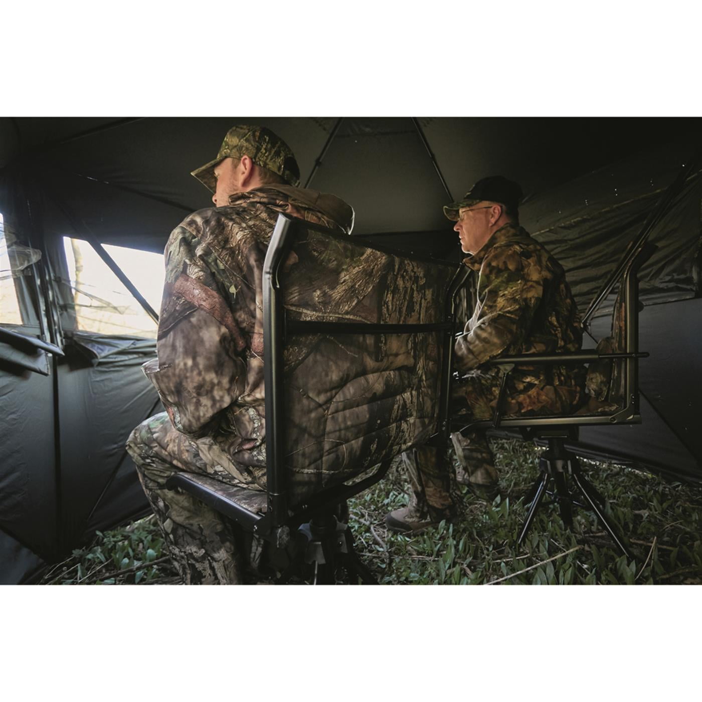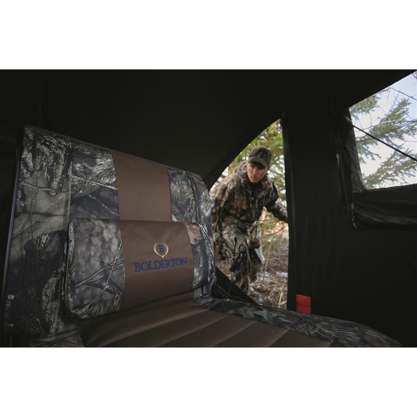 Bolderton 360 Comfort Swivel Camo Hunting Chair We designed our hunting chair for ultimate comfort. The Bolderton silent swivel hunting chair is one that you can sit all day on behind a blind or move around to different hunting spots in comfort. Ground swivel chair for hunting with backrest and thick padding on the back and seat areas to relieve pressure where fatigue often starts to creep in. This blind hunt chair is loaded with features that will keep you agile and supported, a better way to hunt more comfortably. A Comfort Upgrade A silent, 360º swivel action on this rotating hunting seat provides the quick ability to move in any direction, with no squeaking and creaking to give away your location or scare off wildlife. The backrest provides extra comfort to relax your back. Its sturdy steel frame is built to comfortably support hunters up to 300 lbs, which is impressive. Oversized feet help tackle uneven surfaces and make the ground hunting seat more comfortable. Folds Up Flat For Easy Carry This foldable light hunting chair is packable, portable, and very easy to carry to your hunting spot. Folds down and disassembles into two pieces for convenient travel and storage, too. Perfect hunting gear for the hunt, at the cabin or around the bonfire. Smart Features Full nylon bushing in swivel mechanism provides silent, maintenance-free 360-degree swivel action Mossy Oak Break-UpCOUNTRY hunting seat with extra padding for all-day comfort Sliding headrest and lumbar pad Weather-resistant powder-coated steel frame Large, 3″ diameter, fully articulated swivel feet Folds flat and disassembles fo