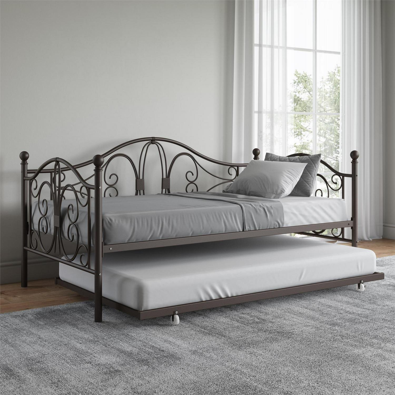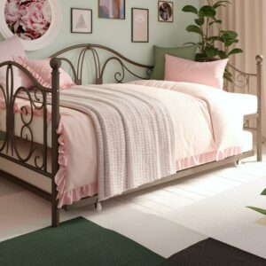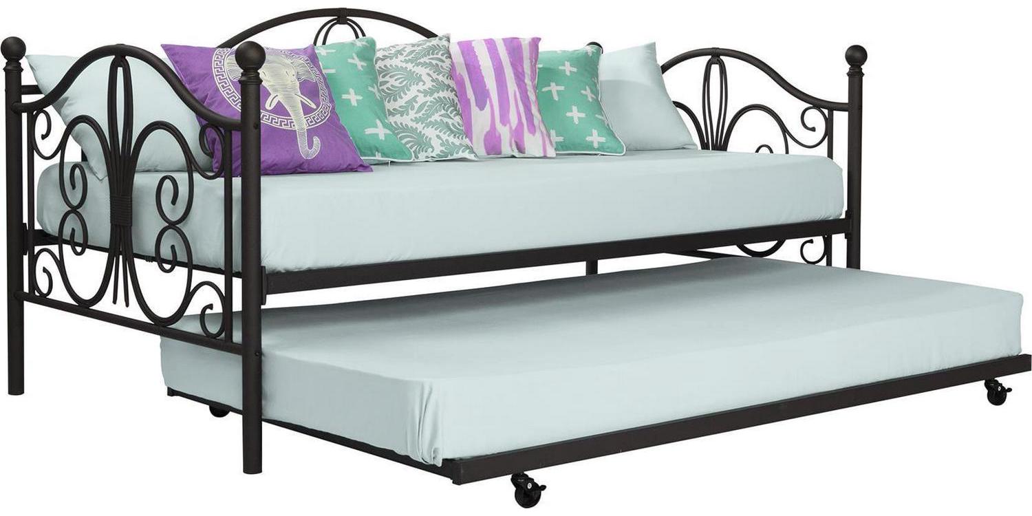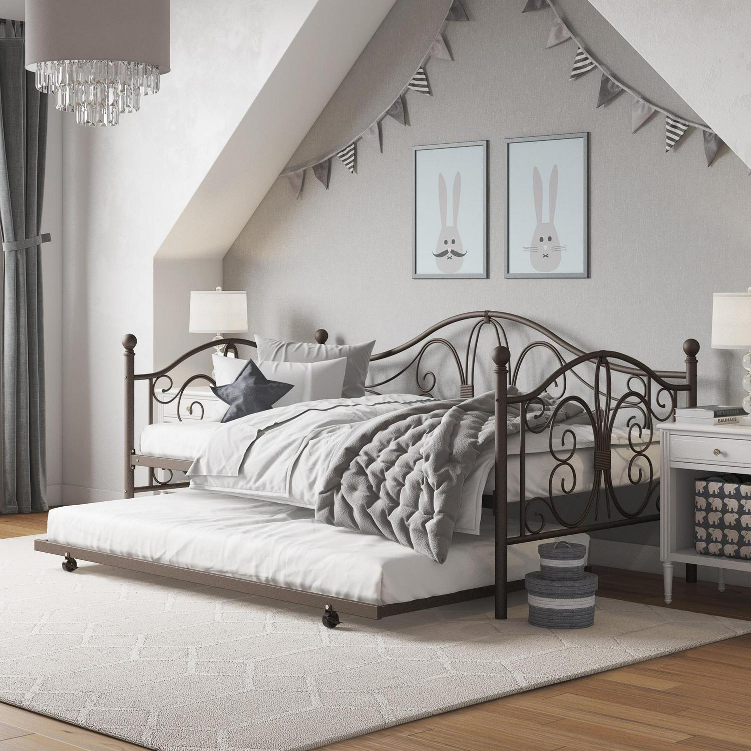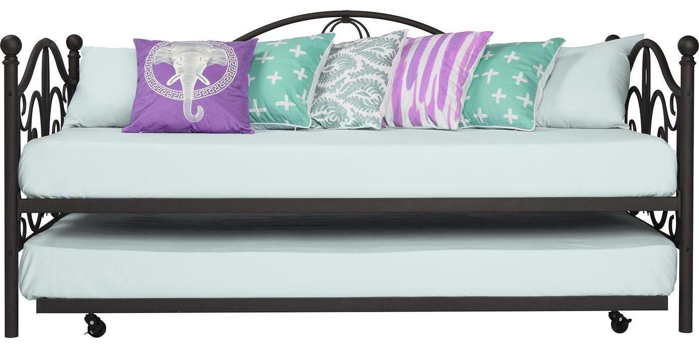 Inspired by the Bombay Metal Bed, DHP has designed a daybed with trundle that exudes a whimsical charm with its elegant curves and detailing. The DHP Bombay Metal Daybed and Trundle is built with a sturdy metal frame that is the perfect addition to any living room, bedroom, child’s bedroom or studio apartment. Available in multiple colors, in Twin and Full sizes, the DHP Bombay Metal Daybed and Trundle is the key to dressing up your room and will become the focal point of your interior décor. It also offers the perfect solution to limited space in small homes. Combined with true practicality, the DHP Bombay Daybed comes with a roll out trundle that locks into place to provide the perfect bed for accommodating overnight guests and offering a comfortable night’s sleep. The daybed and trundle are also equipped with secured metal slats to provide additional support and durability. The Bombay has stunning value and design, all in one package!