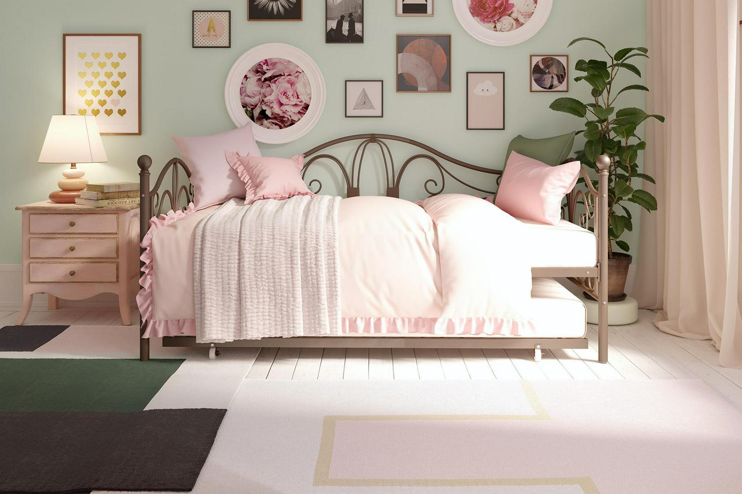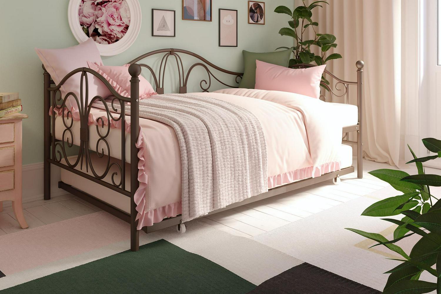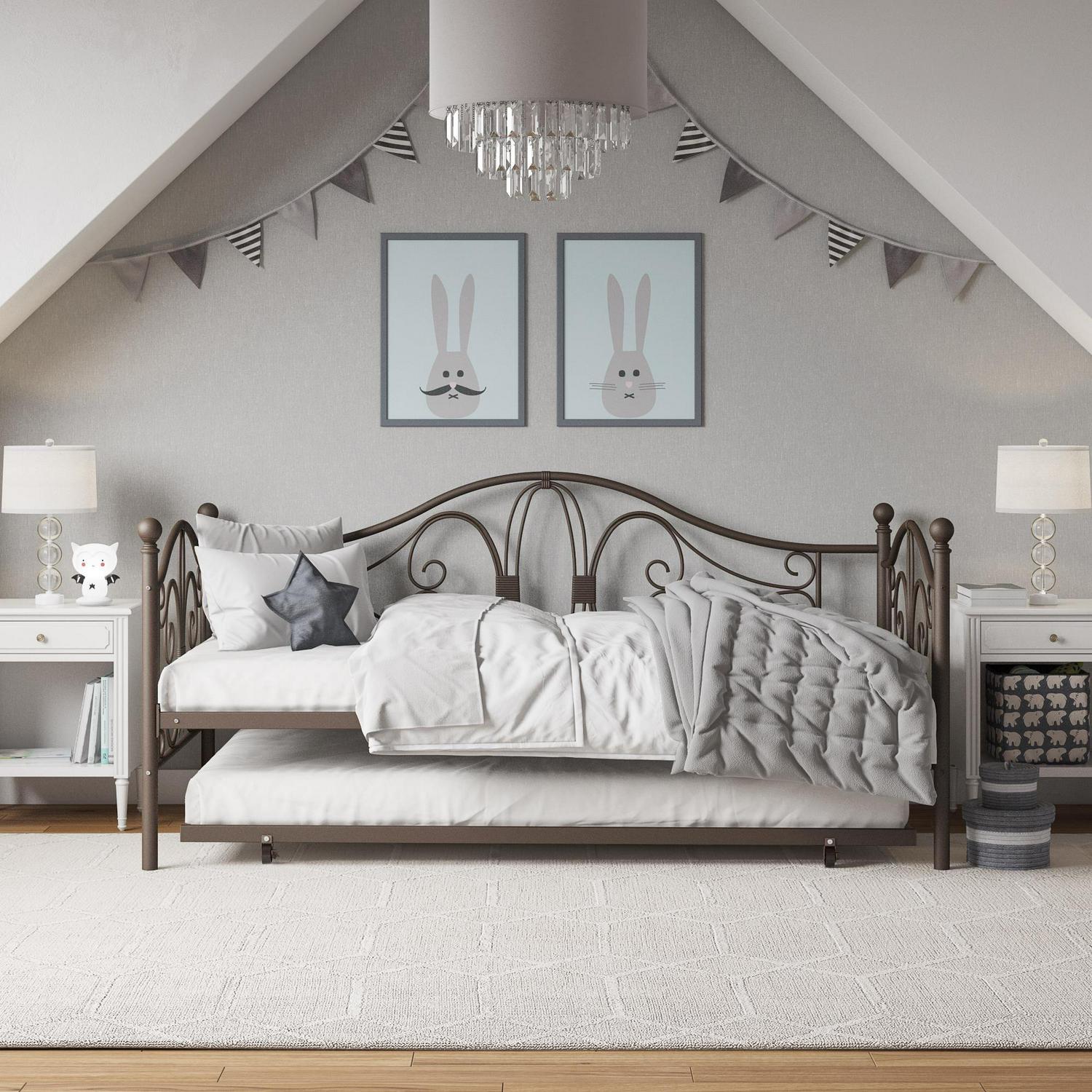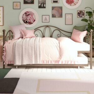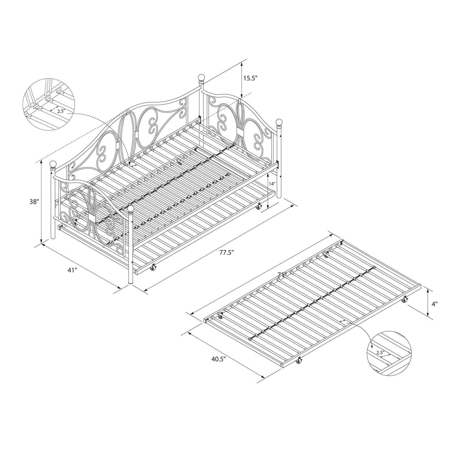 Inspired by the Bombay Metal Bed, DHP has designed a daybed with trundle that exudes a whimsical charm with its elegant curves and detailing. The DHP Bombay Metal Daybed and Trundle is built with a sturdy metal frame that is the perfect addition to any living room, bedroom, child’s bedroom or studio apartment. Available in multiple colors, in Twin and Full sizes, the DHP Bombay Metal Daybed and Trundle is the key to dressing up your room and will become the focal point of your interior décor. It also offers the perfect solution to limited space in small homes. Combined with true practicality, the DHP Bombay Daybed comes with a roll out trundle that locks into place to provide the perfect bed for accommodating overnight guests and offering a comfortable night’s sleep. The daybed and trundle are also equipped with secured metal slats to provide additional support and durability. The Bombay has stunning value and design, all in one package!