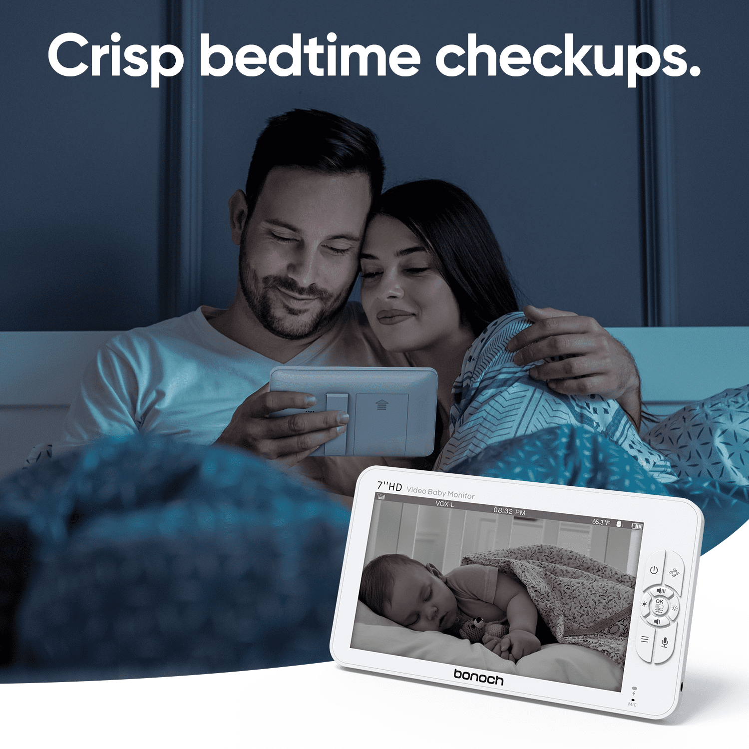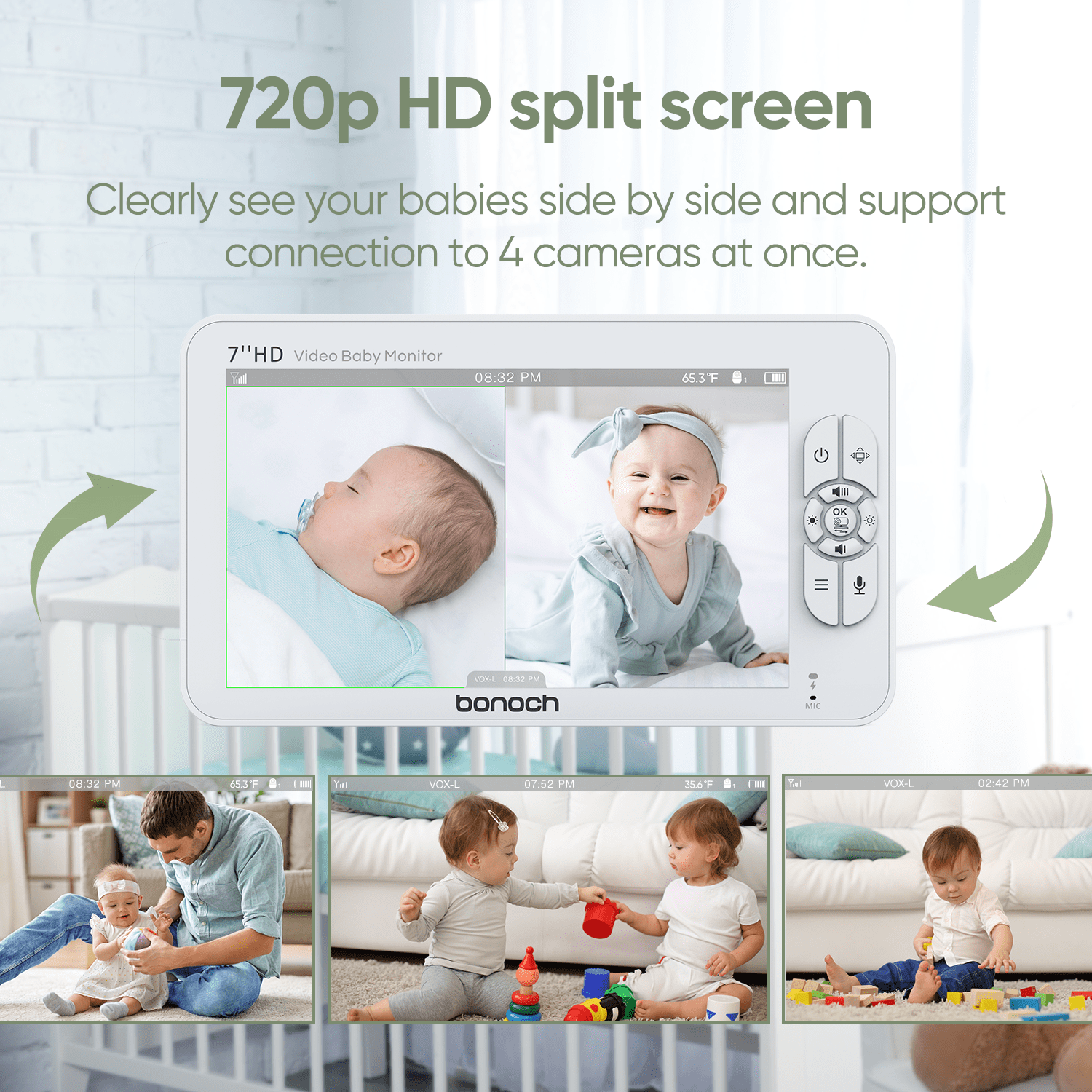 【Effortlessly Take Care of Two Babies】-bonoch baby monitor with 2 cameras allows you keep an eye on both babies on the screen side by side with split screen function. The 7″ 720P HD LCD display provides crystal-clear quality with sharp pictures and 10X more detail. Say goodbye to the hassle of juggling multiple monitors, and hello to a simpler, more efficient way to care for your little ones 【No Worries From Day to Night】- Say goodbye to worries day and night with bonoch baby monitor! The auto night vision provides clear black-and-white images even in pitch darkness, without any red lights to disturb your baby. The 4000mAh battery offers 22 hours of monitoring in VOX mode, which saves battery by stopping transmission in quiet rooms, alerting you only at the first sound 【Stay Connected to Your Baby】- Our baby monitor features real-time sound, two-way talk, and temperature detection. Get alerts when they cry and use 2-way talk to comfort them, or quickly return to their side. The in-room temperature display informs you of your baby’s comfort level. Get peace of mind with bonoch, even if you’re in another room or busy with other tasks 【Entire Room Coverage】- Keep an eye on your baby from anywhere in your home with our baby monitor. The baby camera lens pans 355° and tilts 120° to capture all corners of the room, while 4x zoom lets you get a closer look. You’ll never miss a thing, even if your baby escapes the crib. Enjoy a clear and stable live stream with wireless coverage, and capture baby’s growth moments! 【No Wi-Fi, Secure and Reliable】- The 2.4GHz FHSS wireless connection ensures a secure and private live stream that is only for you. Protect you and your family from privacy leakage. No WiFi, No APP downloading, or account creation is required. Moreover, you will get a warranty for 1 year and lifetime technical support from our friendly customer service