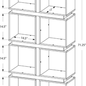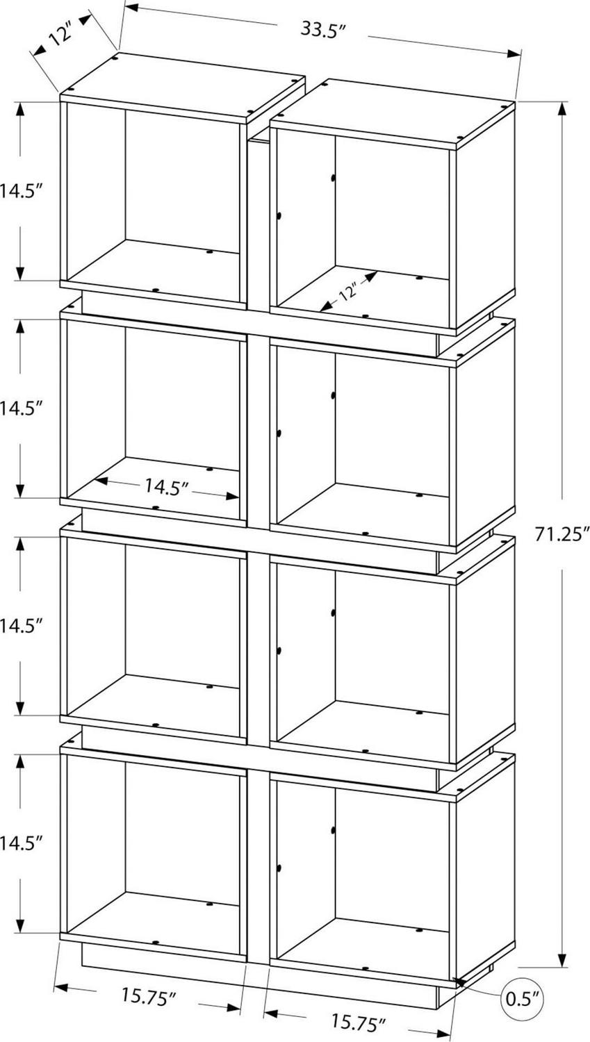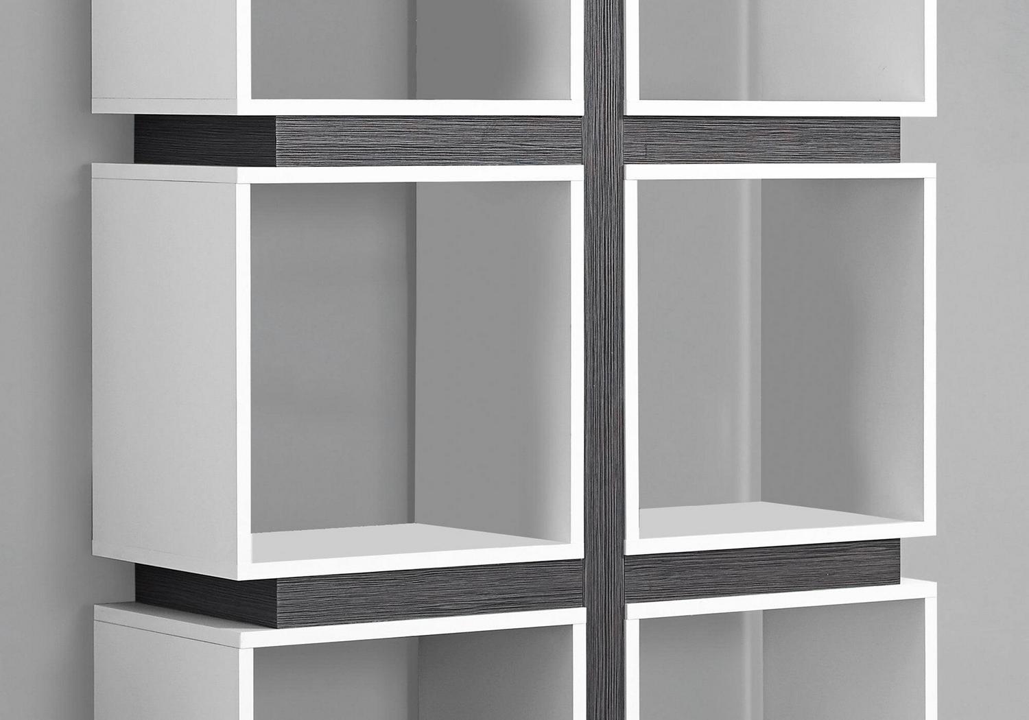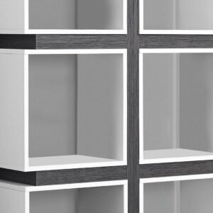 Give your home a modern art-deco look with this 8 cubic shelf bookcase. This perfectly symmetrical bookcase has 8 cubic spaces to showcase all your collectibles. With an open back, this piece can also be used as a room divider when laid down sideways. Featuring thick white paneled shelves accented with a grey cedar finish, this unit will be the focal point of any room.