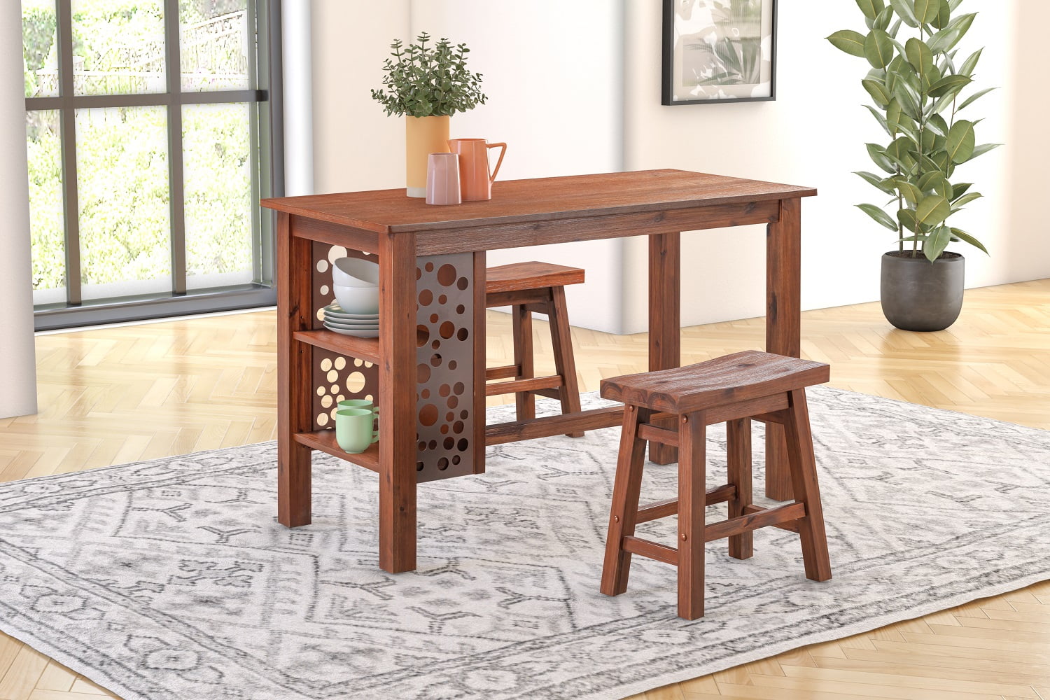 Made from acacia wood, steel, and MDF Multi-step wire-brush finish for rustic style 3-tiered deep multipurpose shelves provide a convenient, spacious, location to store dinnerware, cookbooks, bottles, and more Seats up to 4 guests Pair with the matching Sonoma Saddle Stools (sold separately) The Brittany table comes in your choice of dining or bar height options