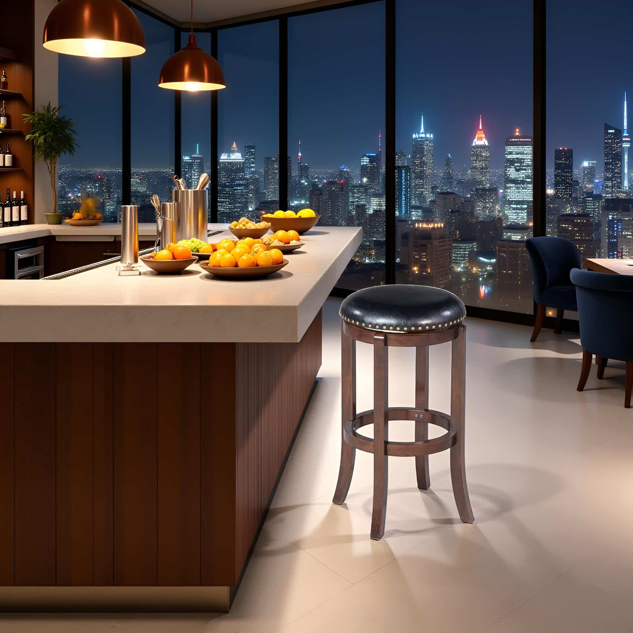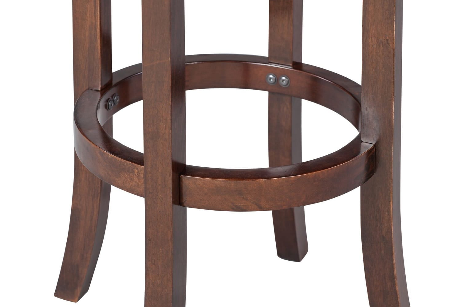 Solid rubberwood frame Black faux leather upholstery Genuine brass nailhead trim 360-degree swivel seat Full steel ball-bearing mechanism Circular stability stretchers double as footrest Seat height available in counter (24 inches) and bar (29 inches) Available in Black, Cappuccino, or Light Cherry Finishes.