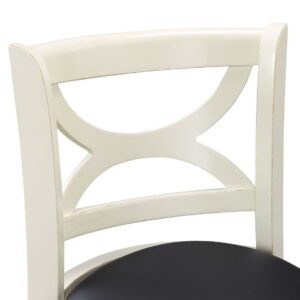 The Florence Swivel Counter or Bar Stool is constructed with the perfect balance of beautiful design and easy comfort. This stool is made from solid hardwood for extra durability. Even the footrest (which also doubles as a stability stretcher) is made from hardwood. The only exception to this rule is the cushioned seat, which is upholstered with black faux leather. Although the solid hardwood frame is precisely constructed, it still features decorative touches like the curving seat back and flared legs. It swivels in a perfect 360-degree circle thanks to the built-in steel ball-bearing swivel plate. Performance tested by leading testing facilities. The perfect addition to your home! Available in two finishes; distressed white and black sandthru