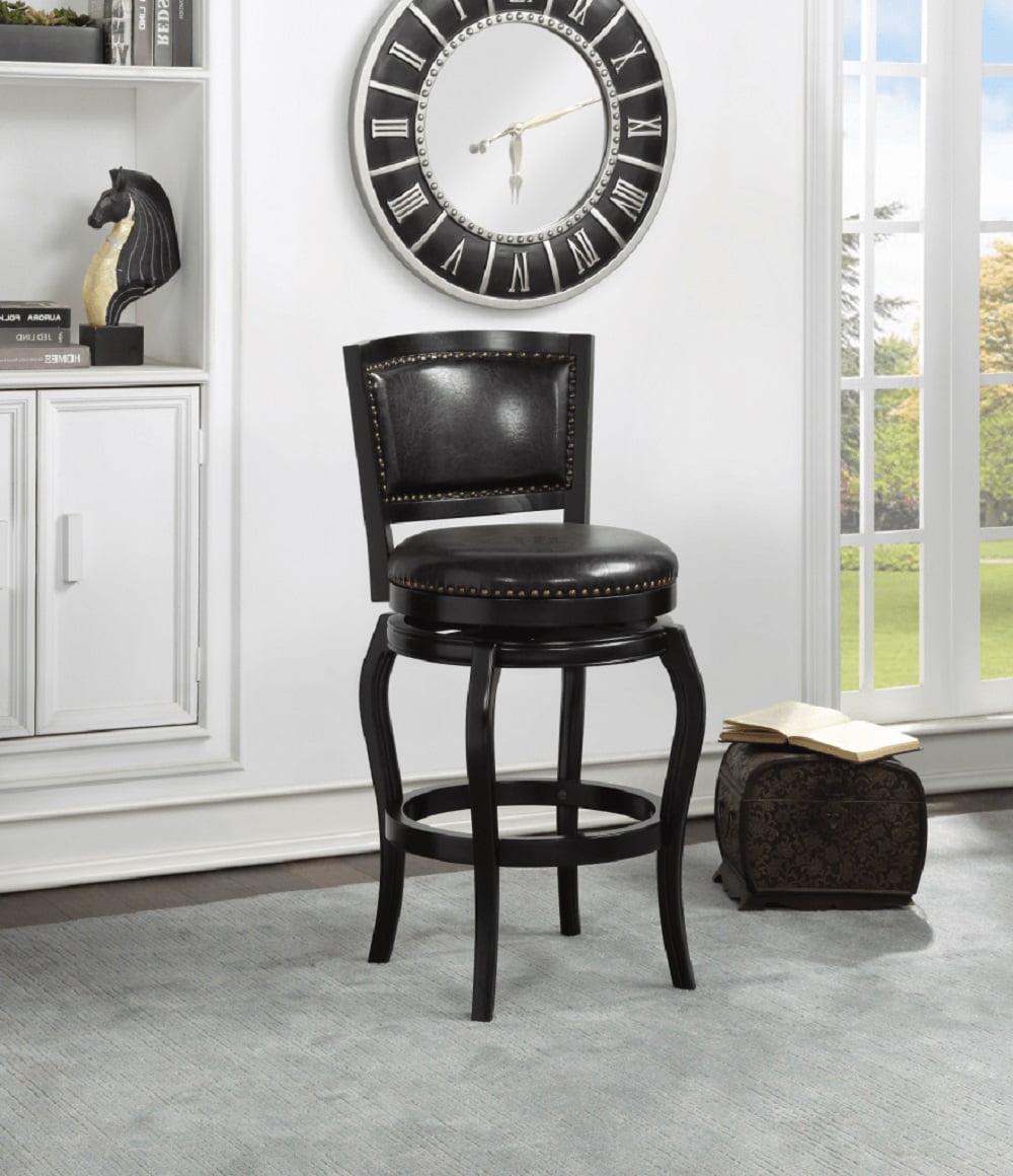 The Harris Swivel Stool knows you take your comfort seriously. That s why it features an oversized seat (22 inches diameter!) with padded high-density foam cushioning in the seat and backrest. For additional support and comfort, the footrest is built from a solid piece of hardwood with a protective metal kickplate that guards against scuffs and scratches. Genuine brass nailheads provide a traditional accent to the black faux leather upholstery. The Harris is available in three different finishes: Cappuccino, Black, and Cherry. Make this a three-piece set by pairing two barstools with Boraam s Florence pub table in a matching color. This stool is recommended for residential use only.