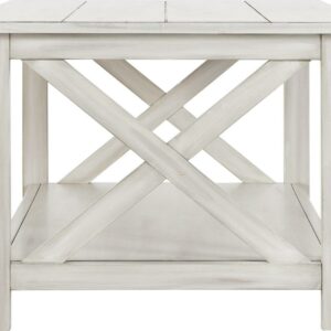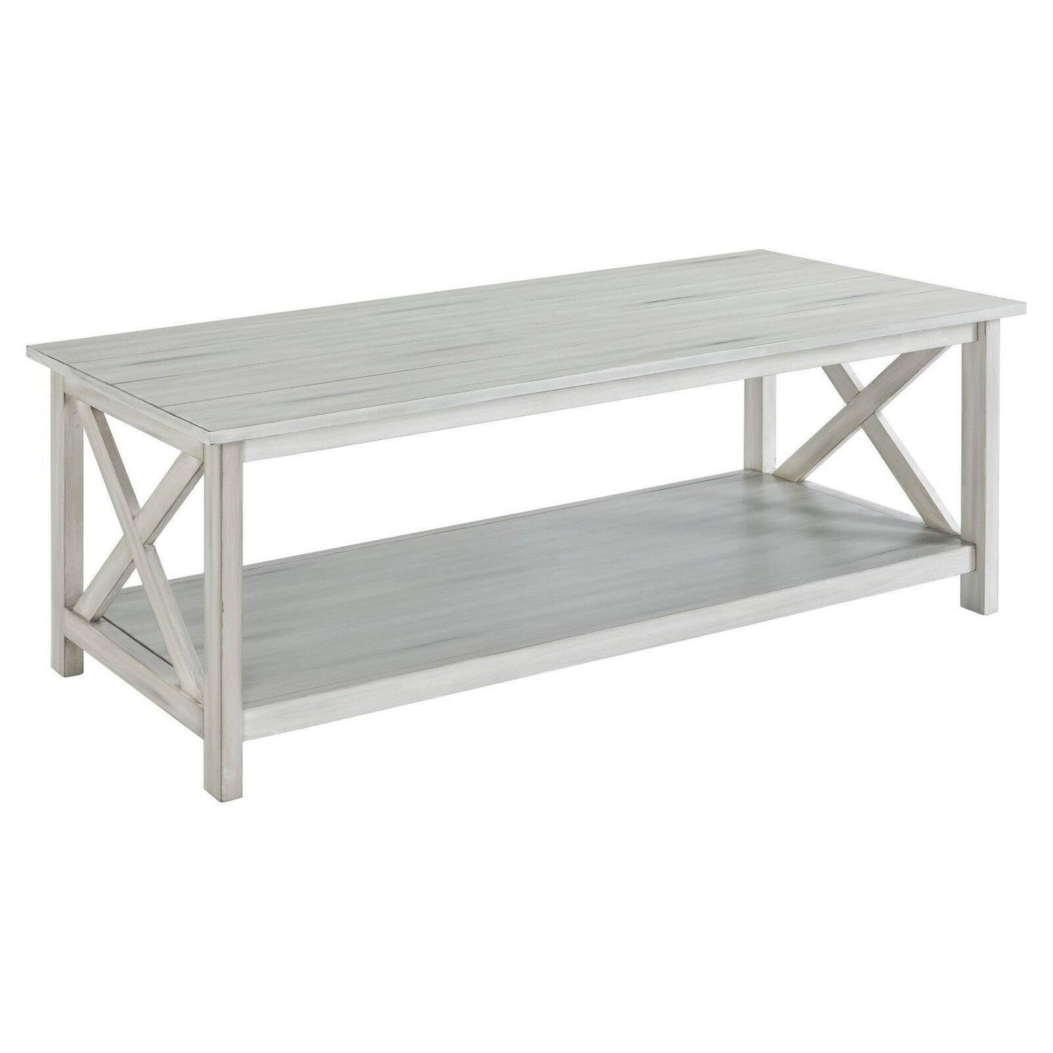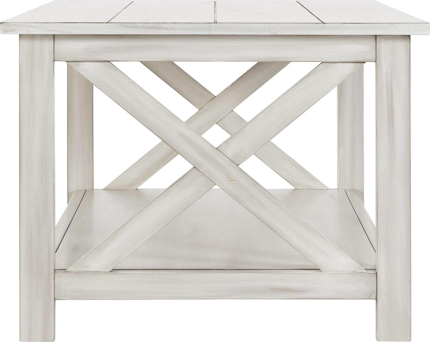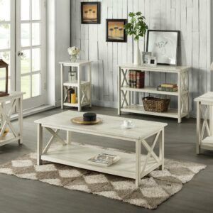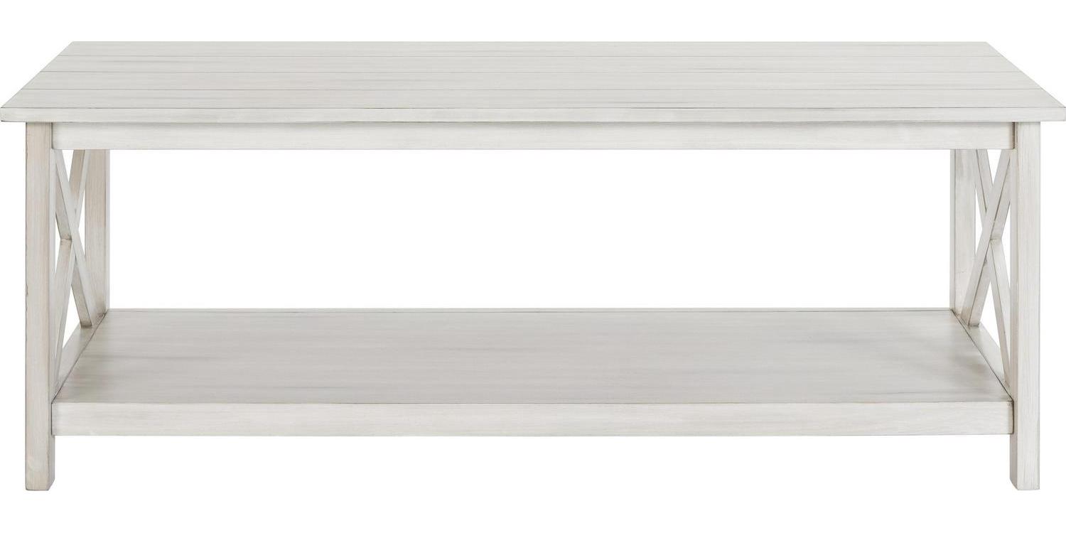 Outfit your living room in refined farmhouse style with the Jamestown Coffee Table. This charming table is crafted from MDF and solid wood. Plank detailing on the tabletop and lower shelf create the illusion of a reclaimed piece. The antique white finish further adds to the cozy downhome feel. Transform your home with the other farmhouse-inspired Jamestown living room and dining room furniture from Boraam.