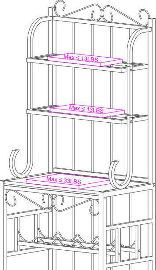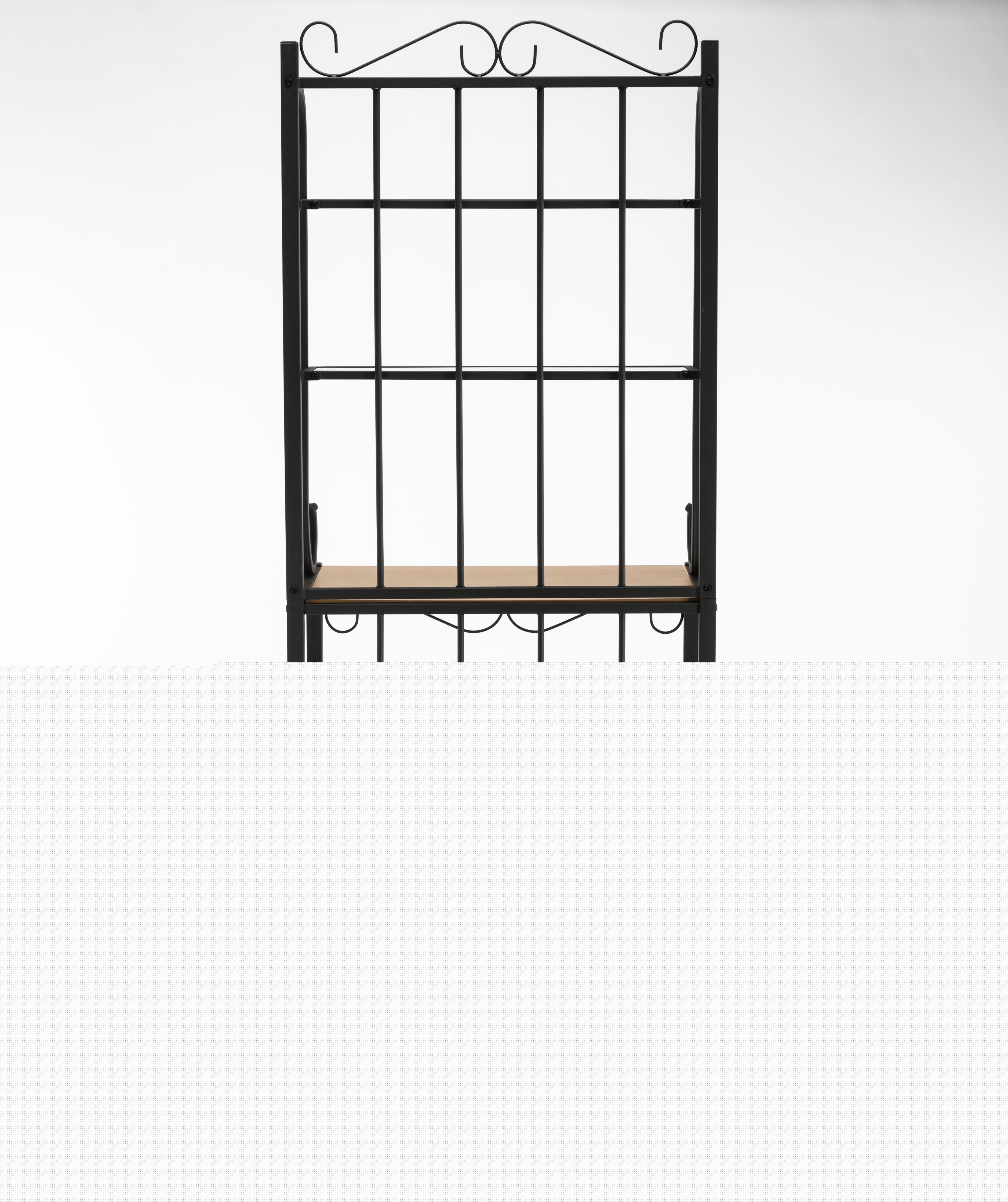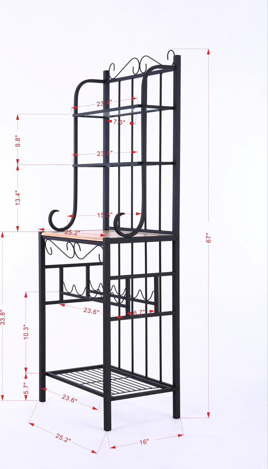 Add a beautiful solution to your storage, countertop, and display needs with the Boraam Praha 4-Tier Metal Baker s Rack. Built from sturdy steel with a black powder-coated finish, this durable rack fits into any design aesthetic. Its four shelves offer ample storage by storing kitchen implements, such as cookware, glassware, your precious china, or decorative accents. The built-in 5-bottle wine rack makes it easy for you to create your own entertainment area for parties or everyday living. Get the best of design and functionality with the Praha Baker s Rack.