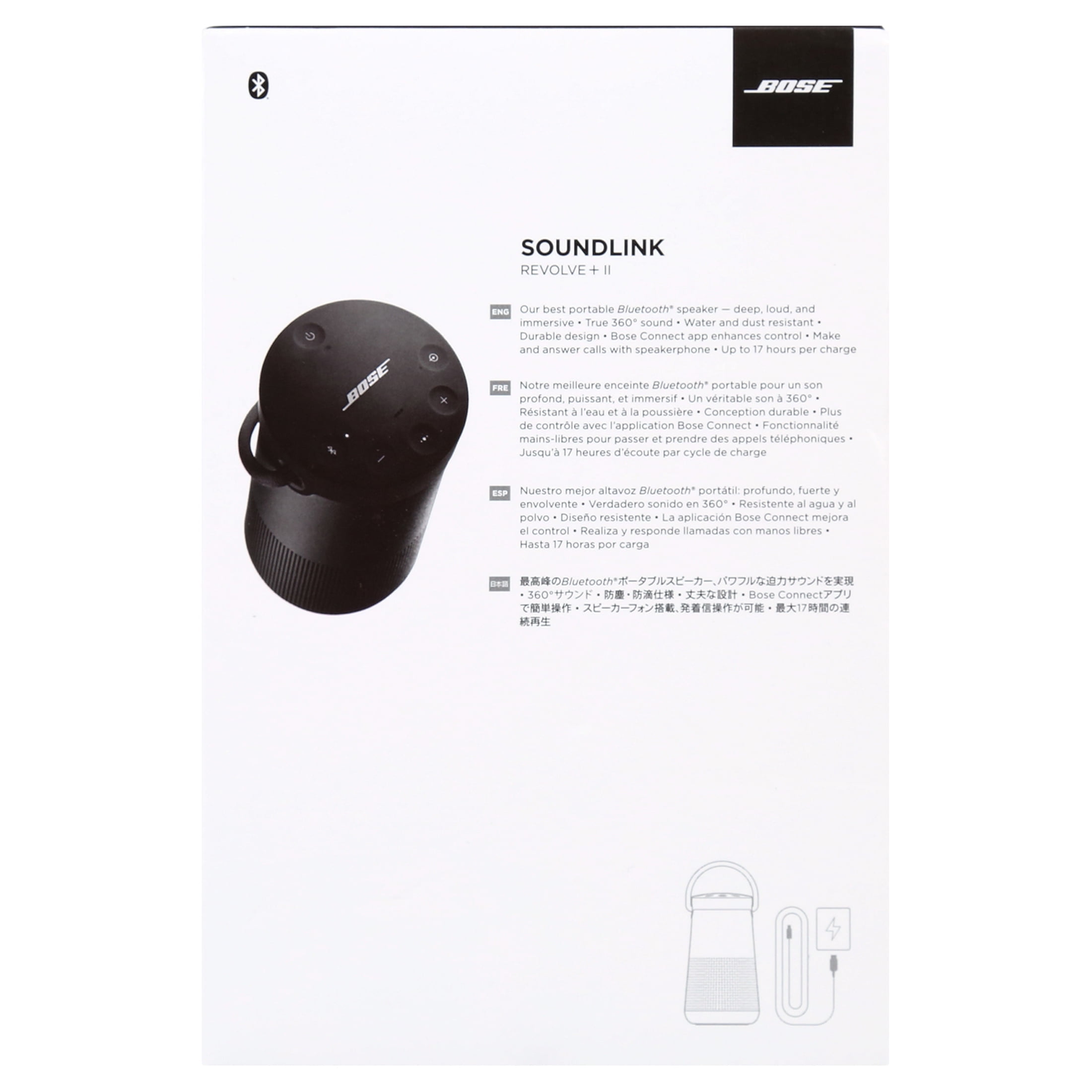 In the backyard, at the beach, or living room, kick your fun up a notch with SoundLink Revolve+ Series II. Bose’s best-performing Bluetooth speaker spreads deep, jaw-dropping sound in every direction. Place it in the center of the space to give everyone the same experience. Or, set the wireless speaker near a wall and sound will wrap around the room, making you feel like you’re at your favorite concert. This portable speaker has a durable case for protection, and if it starts to rain, you don’t have to worry since the Bose SoundLink Revolve+ Bluetooth speaker is water-resistant. Grab and go — take this portable speaker outdoors to the park for a fun picnic, on a family camping trip for nighttime dance parties, or simply place it on your end table and fill your living room with your favorite music. The rechargeable battery plays up to 17 hours for full-day listening. Voice prompts talk you through Bluetooth pairing, and there’s a built-in speakerphone for calls. Use the Bose Connect app to pair two SoundLink speakers for Stereo or Party Mode. Away from your phone? Connect by pressing the Bluetooth button on connecting devices via SimpleSync technology. The app also helps you manage your devices, unlock features and access future updates.