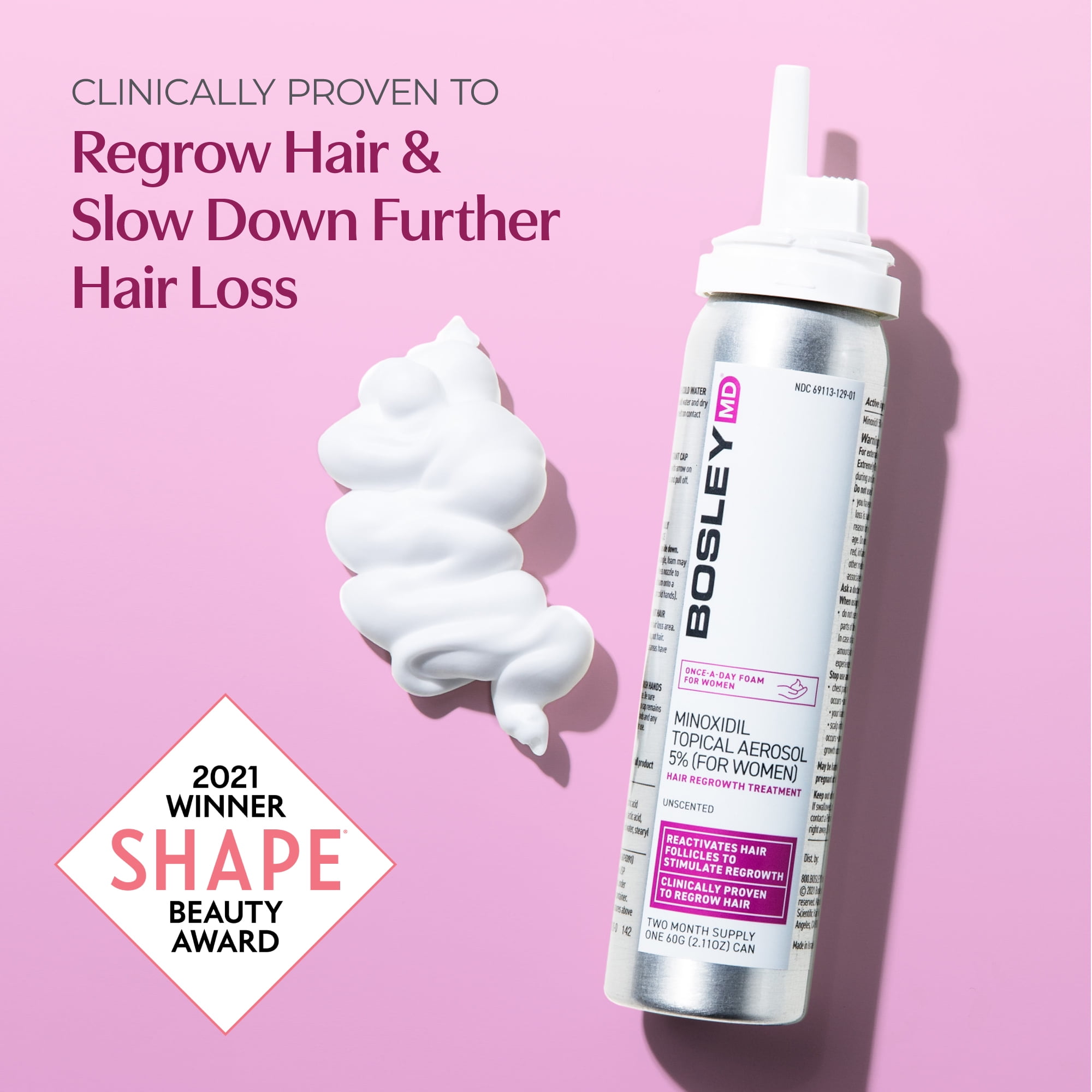 MINOXIDIL is an FDA-approved drug to regrow hair Easy-to-use foam application Dispense half a cap full of foam onto a cold surface. Part hair to expose hair loss area. Massage into scalp. Active: Minoxidil 5%. Inactive: Butylated Hydroxytoluene, Cetyl Alcohol, Citric Acid Anhydrous, Dehydrated Alcohol, Isobutane, Lactic Acid, N-Butane, Polysorbate 60, Propane, Purified Water, Stearyl Alcohol. BosleyMD Women’s Regrowth Treatment 5% Minoxidil Foam