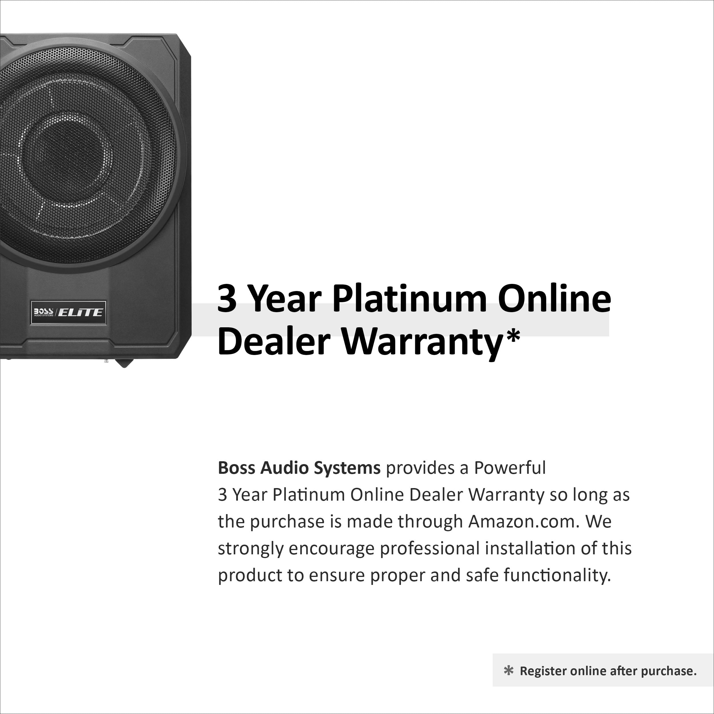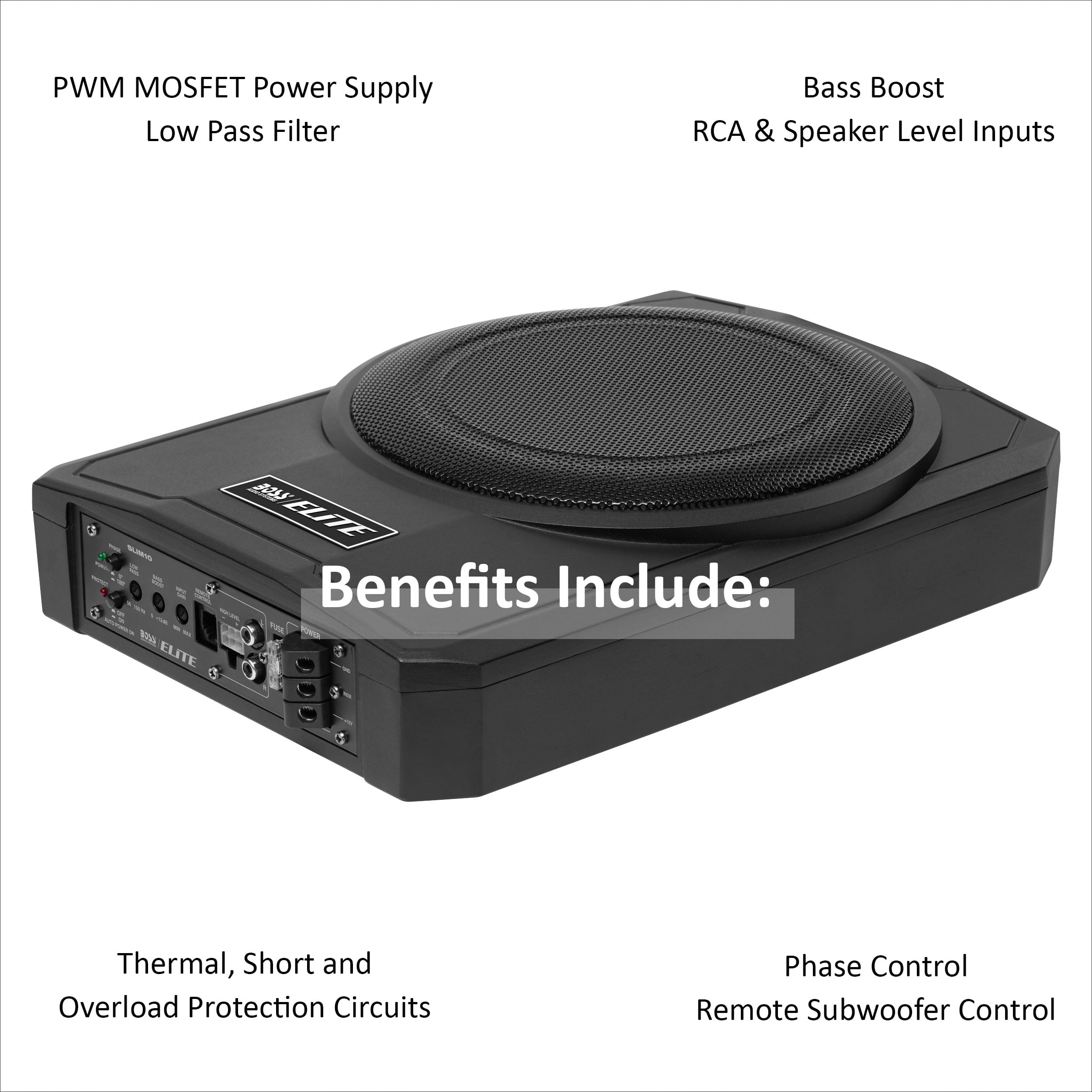 Space Saver – If you are tight on space, this is a great solution for you. The combination of amplifier and subwoofer all into one, makes this ideal for spatially challenged vehicles. With a slim design, there are a few installation options Pulse Width Modulated – PWM simplifies power supplies. It controls the output voltage and current precisely by not only removing the output current sensing loss, but also eliminating all secondary feedback circuitry. Efficiency. Increased reliability Variable Low-Pass Filter – A low-pass filter is an electronic circuit that removes all the notes below the filter’s frequency setting. You will use the Low-pass filter to primarily keep high notes out of your subwoofer(s) High Level Inputs – Speaker level inputs are commonly referred to as high-level inputs. It will be used to connect the SLIM10 to your factory radio or an aftermarket radio that does not have low-level (RCA) inputs Low Level Inputs – Line level inputs, also known as RCA inputs or low-level inputs, use RCA interconnect cables to link the SLIM10 with the source unit. Most aftermarket radios have multiple pairs of RCA outputs that can connect to multiple amplifiers Space Saver – If you are tight on space, this is a great solution for you. The combination of amplifier and subwoofer all into one, makes this ideal for spatially challenged vehicles. With a slim design, there are a few installation options Pulse Width Modulated – PWM simplifies power supplies. It controls the output voltage and current precisely by not only removing the output current sensing loss, but also eliminating all secondary feedback circuitry. Efficiency. Increased reliability Variable Low-Pass Filter – A low-pass filter is an electronic circuit that removes all the notes below the filter’s frequency setting. You will use the Low-pass filter to primarily keep high notes out of your subwoofer(s) High Level Inputs – Speaker level inputs are commonly referred to as high-level inputs. It will be used to connect the SLIM10 to your factory radio or an aftermarket radio that does not have low-level (RCA) inputs Low Level Inputs – Line level inputs, also known as RCA inputs or low-level inputs, use RCA interconnect cables to link the SLIM10 with the source unit. Most aftermarket radios have multiple pairs of RCA outputs that can connect to multiple amplifiers Variable Bass Boost – Variable Bass Boost allows you to adjust the low bass within the boost range to just the way you like it Specs – Dimensions: 13.58” x 10.43” x 3.15”, Weight: 10.45 lbs. Phase control. LED status indicator. Thermal, Short and Overload Protection Circuits. High Performance Voice Coil. Rubber Surround. Aluminum Cone Warranty – BOSS Audio Systems provides a Powerful 3 Year Platinum Online Dealer Warranty so long as the purchase is made through Amazon.com. We strongly encourage professional installation of this product to ensure proper and safe functionality One 10″ Woofer with SINGLE 2.6 ohm Voice Coil 1000 Watts MAX 500 Watts RMS Power Handling RCA & Speaker Level Inputs, High Level Inputs Thermal, Short and Overload Protection Circuits, Power & Protection LEDs Phase Control, Low Pass Crossover, Variable Bass Boost, Input Gain Control S/N Ratio> 90 dB, Frequency Response 30Hz to 150Hz Remote Subwoofer Control