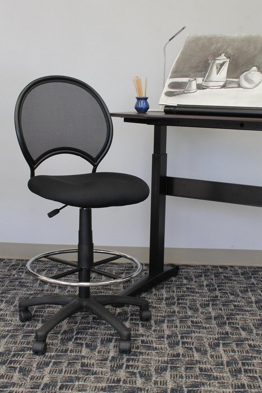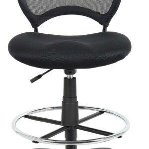 Boss offers an elegant and affordable drafting chair that is breathable and comfortable. The back of the chair features a solid black frame that is wrapped in ballistics nylon, making for a breathable and taut surface on which to rest your back. The seat cushion is a mass of padding that makes for a very wonderful place to sit. The chair also has a metal foot ring for a comfortable spot to put your feet.