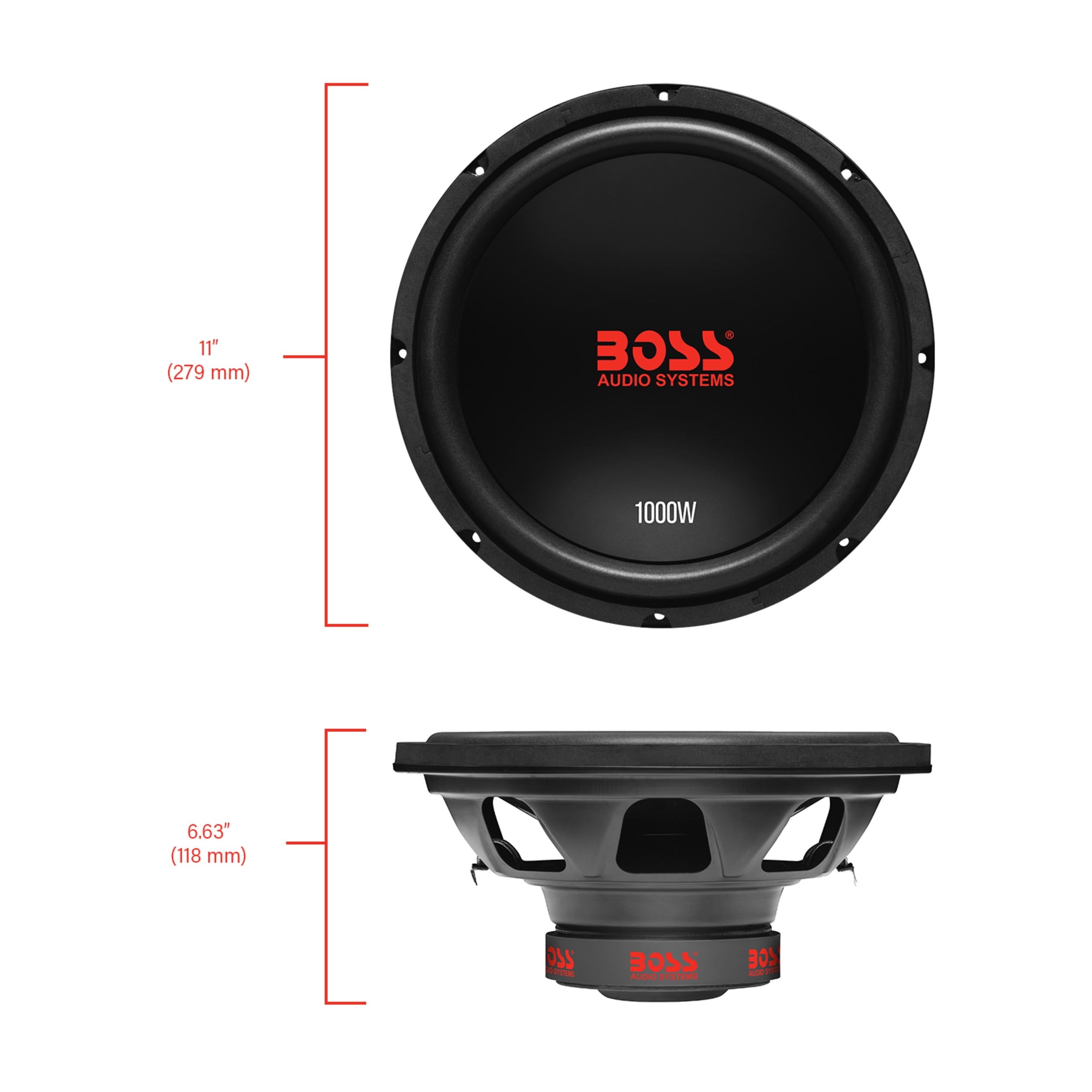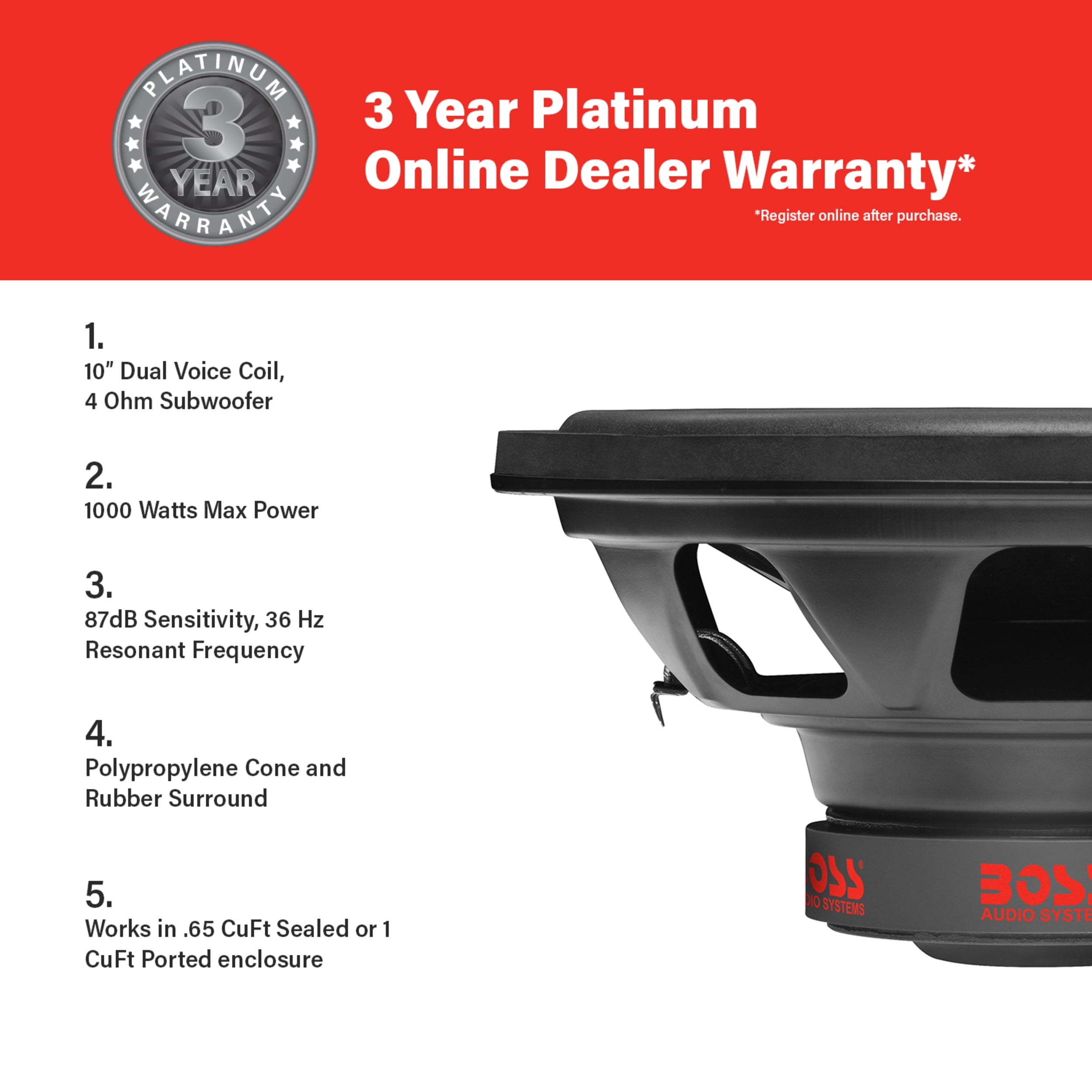 10-inch woofer with dual 4-ohm, 2.5-inch voice coil Features 1,000 watts of max power and 500 watts of RMS power 87 dB sensitivity with 36 Hz of resonant frequency Sharp sound with the polypropylene cone and rubber surround Ideal for 0.65 cubic foot sealed or 1 cubic foot ported enclosures Specifications: Max power: 1,000 watts RMS power: 500 watts Voice coil: Dual Impedance: 4 ohms Mounting diameter: 9.19 inches Mounting depth: 4.5625 inches Sensitivity: 87 dB Recommended sealed: 0.65 cubic feet Recommended ported: 1 cubic feet Port frequency: 38 Hz Color: Black Dimensions (L x W): 10 x 4.56 inches Manufacturer warranty: 1-year warranty
