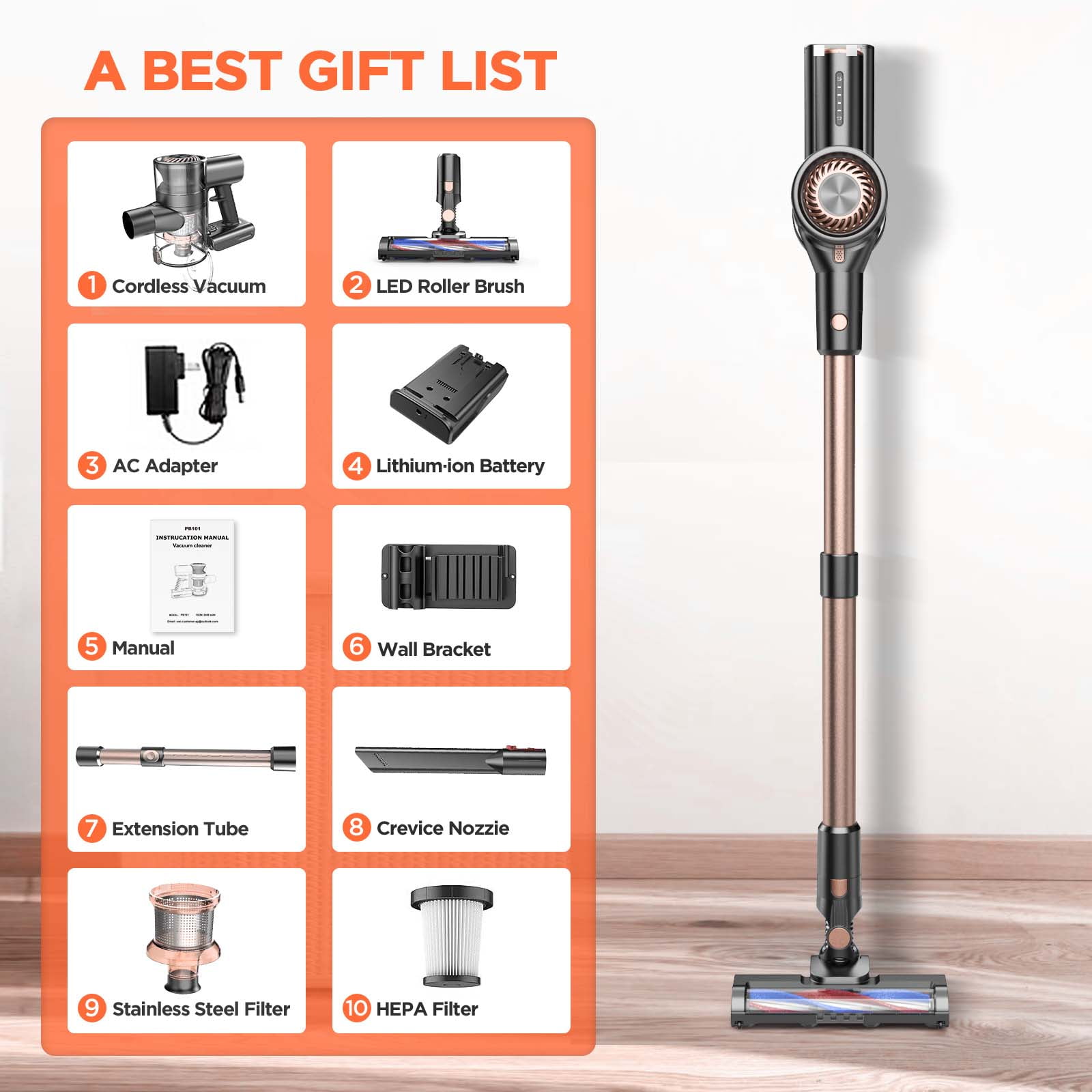 Bossdan Cordless Vacuum Cleaner offers a powerful suction with 150W advanced digital motor, effectively removing dirt and debris from various surfaces. With 2200mAh long-lasting battery providing over 35 minutes of runtime, clean large areas effortlessly. Bossdan upright vacuum cleaner LED light ensure no dust is missed, even under furniture or in low light conditions, can easy tackle any cleaning task, from carpets to hard floors. ✅ Hyper Power Suction — Outfitted with the advanced brushless motor, this cordless vacuum boasts a 25% more powerful suction, making stubborn dirt and dust removal effortless. ✅ Long-Lasting Runtime — With a high-capacity 2200 mAh battery, this cordless vacuum provides up to 35 minutes of continuous cleaning, allowing you to clean your entire home without interruption. ✅ 5-Stage Cyclone Filtration System — The advanced cyclone filtration system captures and separates dust and dirt from the air, ensuring that only fresh air is released back into your home. ✅ 4-in-1 Roller Brush — The versatile 4-in-1 roller brush works on various surfaces from hard floors to curtains and carpets without needing any brush replacement. Adjustable 180°swivel sideways and 90° up-down function easily clean in corners or hard-to-reach areas. ✅ Convenient & Noiseless Operation — This vacuum cleaner with super-light materials effectively reduces noise and offers a quiet cleaning experience. An ideal gift for family and friends who value cleanliness and tranquility at home. 【Warm Tip】: To ensure your vacuum maintains strong suction, please clean the filter regularly. Also, make sure the filter is completely dry before reinstalling it. 【Notes before using】: 1. Use the Original Adapter: Ensure you’re using the original adapter to avoid charging issues. 2. Check Connection Points: Inspect the charger and battery connection pins for any foreign objects or oxidation. Clean with a dry cloth if needed. 3. Monitor Indicator Lights: Look for a flashing red light, which indicates the machine is in protection mode. If you encounter any issues regarding battery life, please feel free to contact us, and we will to provide a solution.