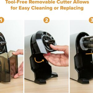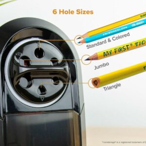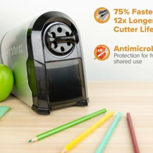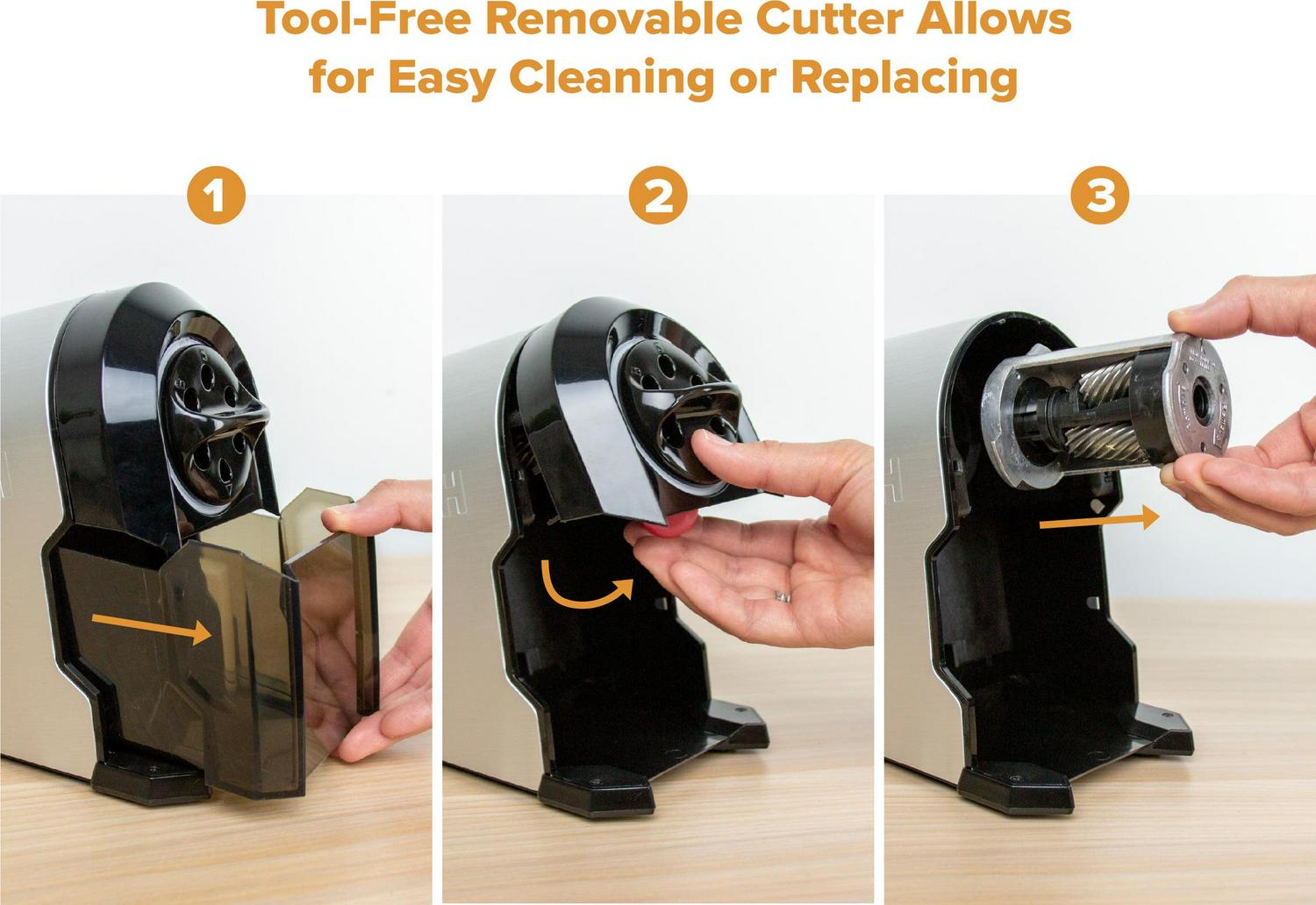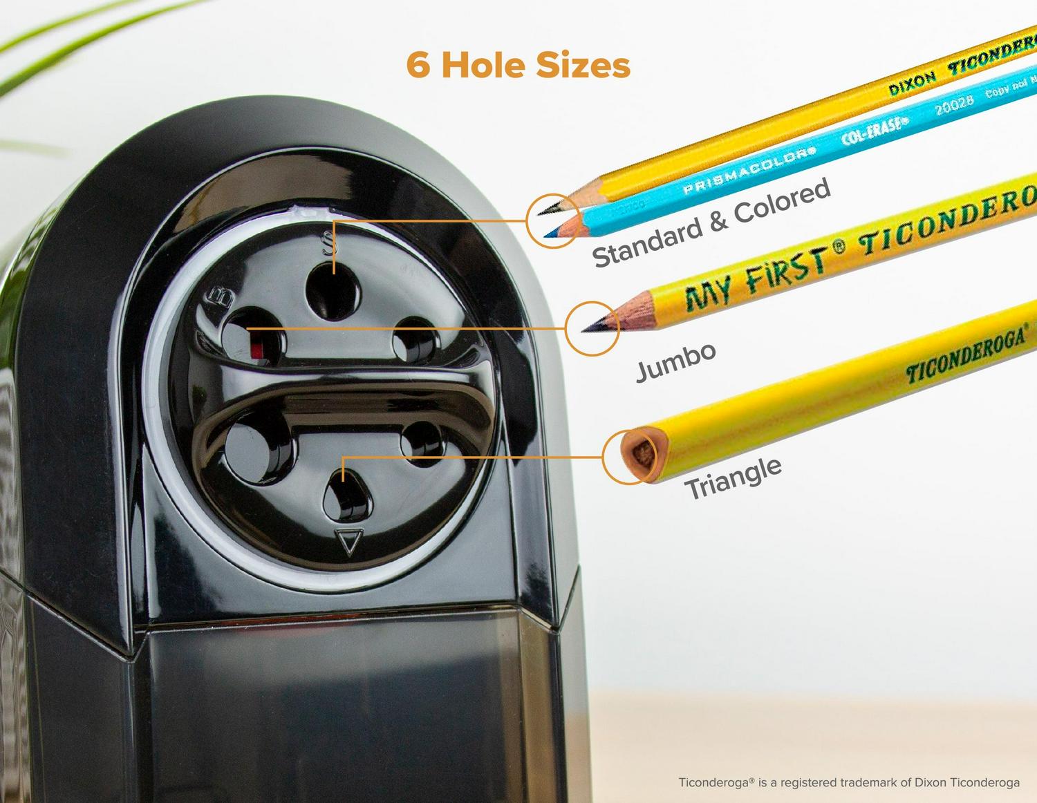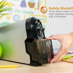 Constructed for demanding environments. It’s equipped with a robust QuietSharp fan cooled motor to provide continuous quiet operation and delivers 75% faster sharpening speeds. Skillfully, the SharpStop will automatically shut the sharpener down when sharpening is completed, followed by the SharpGlow illumination emitting a white light around the dial to provide a clear visual indicator when sharpening is complete. Built with our XHC dual cutter cartridge technology to provide more precise sharpening and features tool-free removal for quick and simple cleaning or replacement! Its conveniently colored pencil compatible and its 6-size dial accommodates numerous pencil sizes including Tri-Write. The high capacity shavings tray features our MagnaSafe tamper proof safety switch that shuts down the motor when the tray is removed for added protection. 7 year limited warranty.