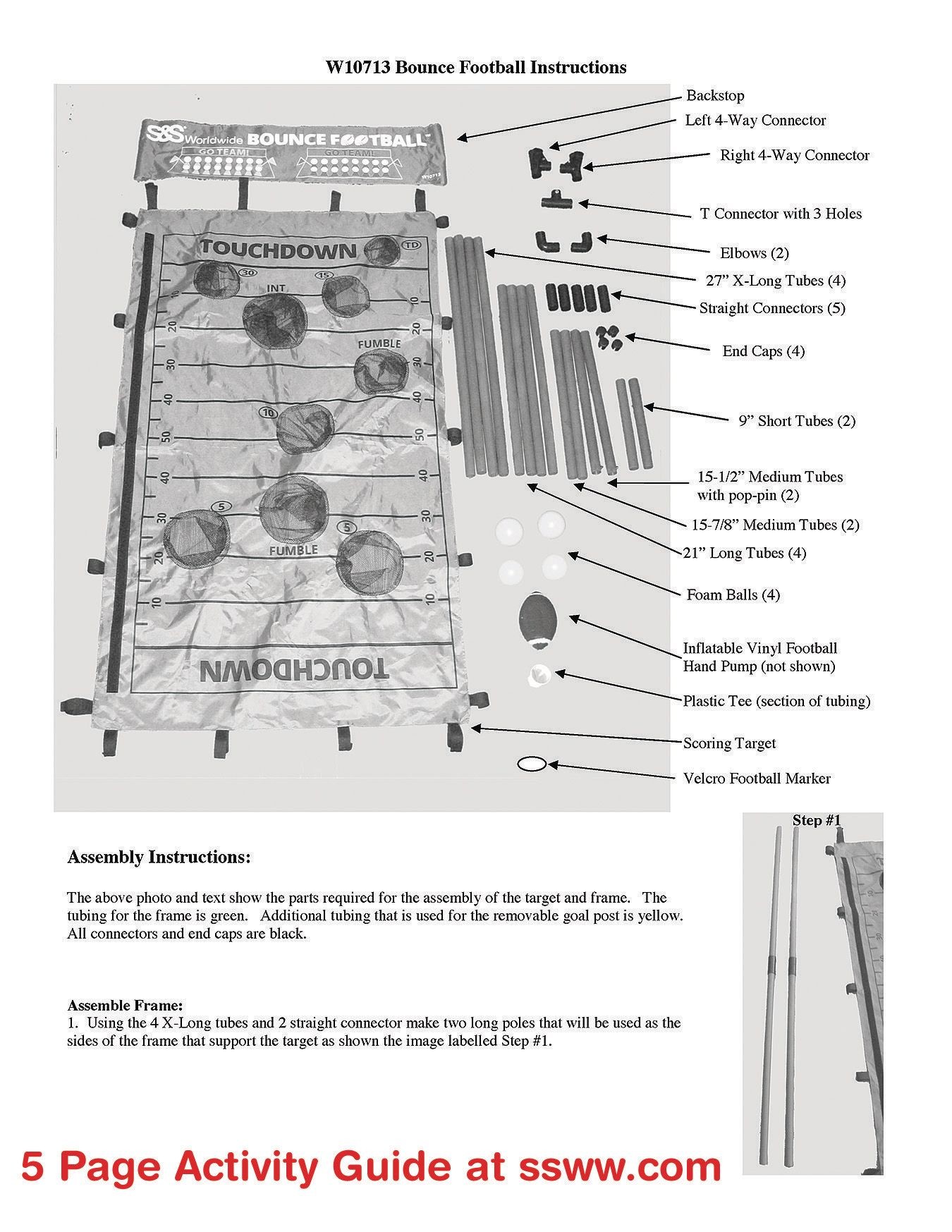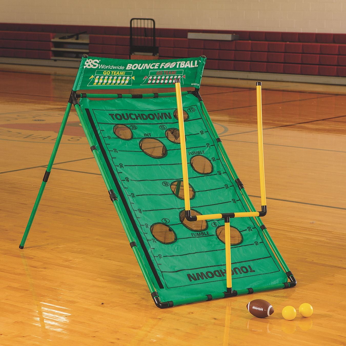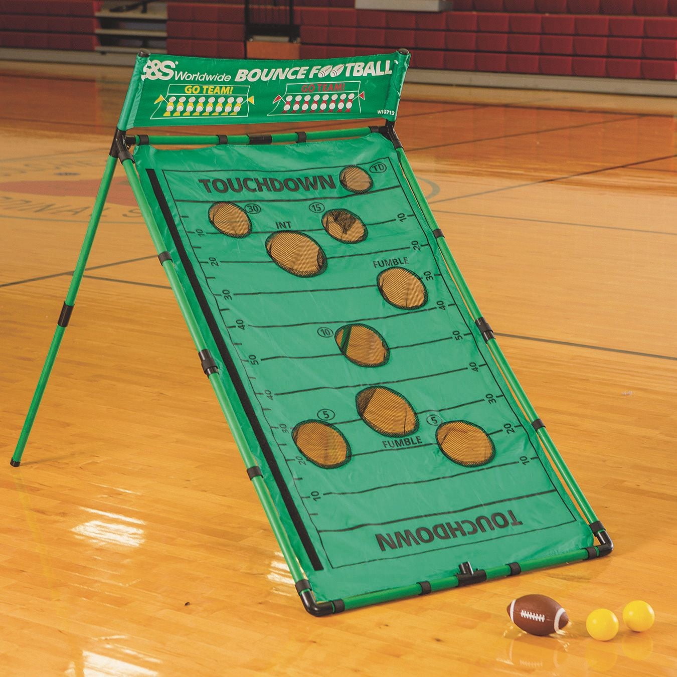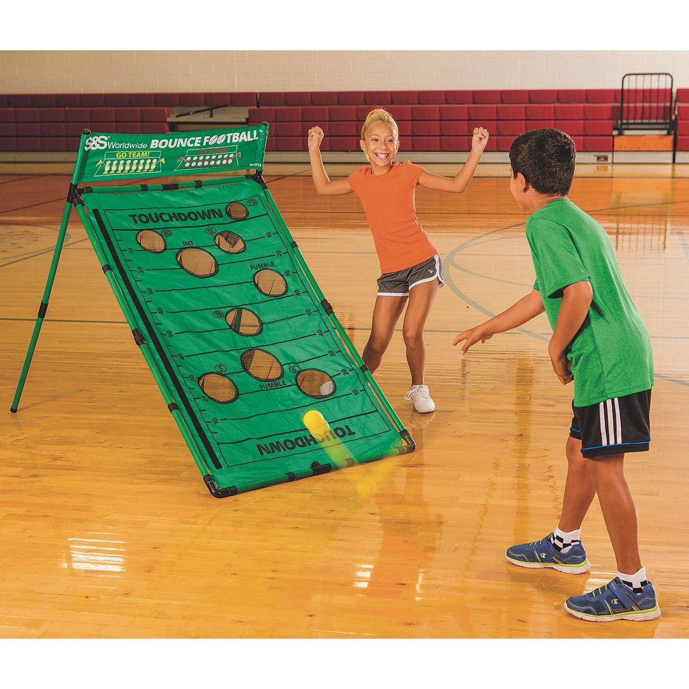 Bounce Football: Kids kick and bounce their way to victory Our exclusive new game features a 34″ x 56″ multi-position target with a removable goal post, 4 extra bouncy foam balls and a tee with mini football for kicking field goals Players move the football by bouncing the balls into 1 of 9 catch pockets on the target, each with a different “play” value Complete a pass for 15 yards or TD, just don’t get intercepted A missed pocket counts as an incomplete pass For 2 to 4 players, ages 8 and up