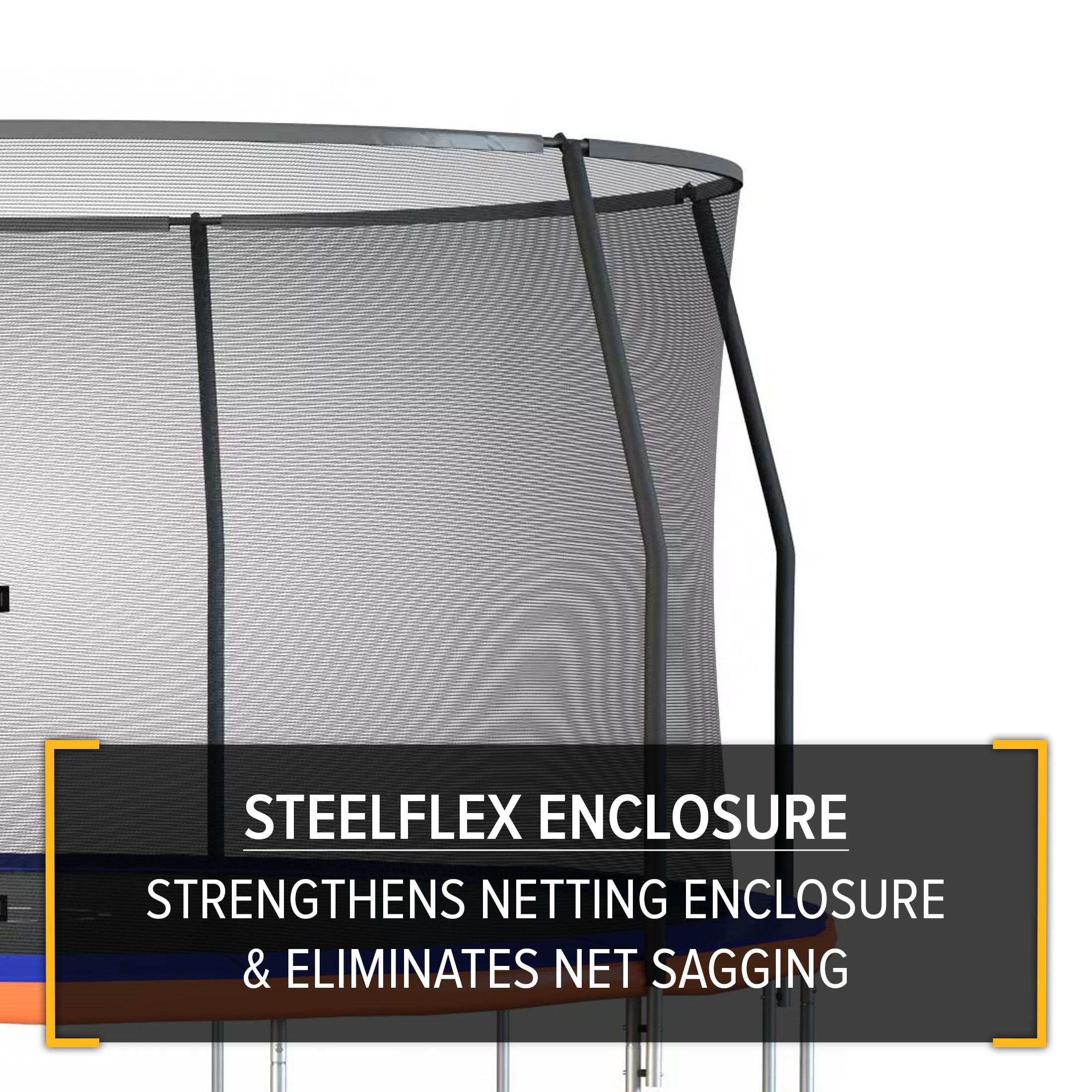 10ft Diameter which is perfect size for smaller yards and younger kids. Great for outdoor fun. Heavy Duty, rust resistant galvanized steel frame to provide long-lasting, safe play Patented SteelFlex Safety Enclosure provides extra safety and better aesthetics Jump Mat & enclosure netting tested to 2x the industry standard for UV resistance, to ensure durability Play features include a fabric basketball backboard, flash light zone (batteries required, not included) and a phone safety pouch
