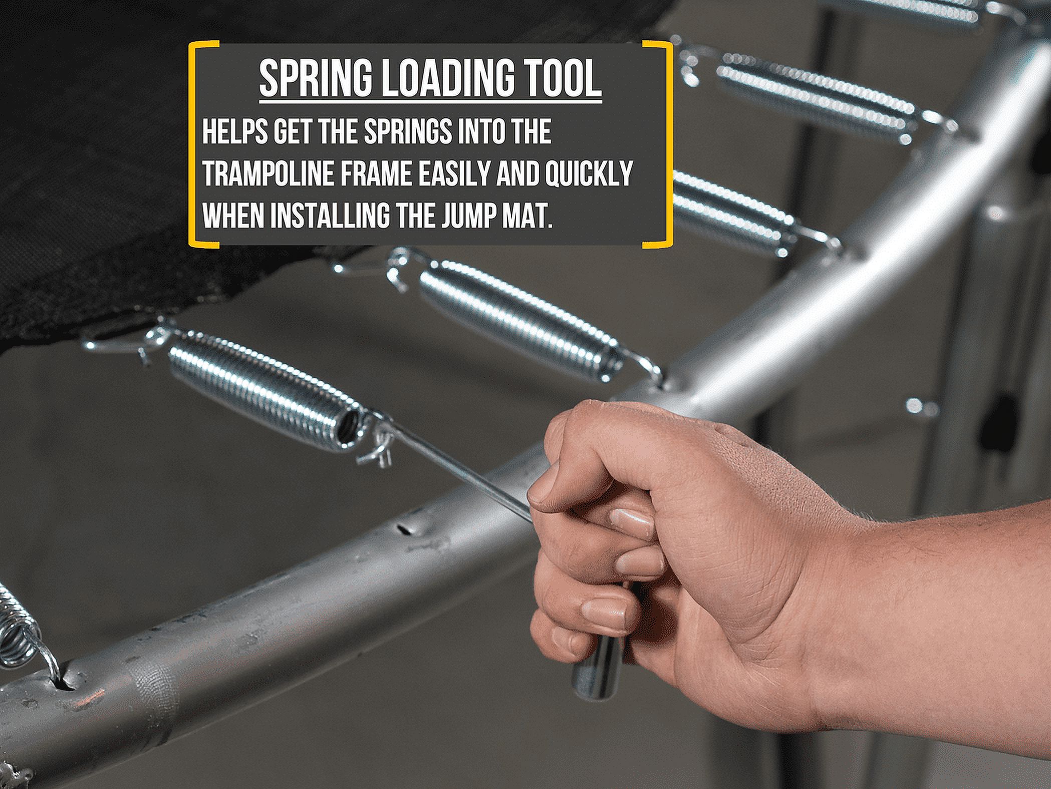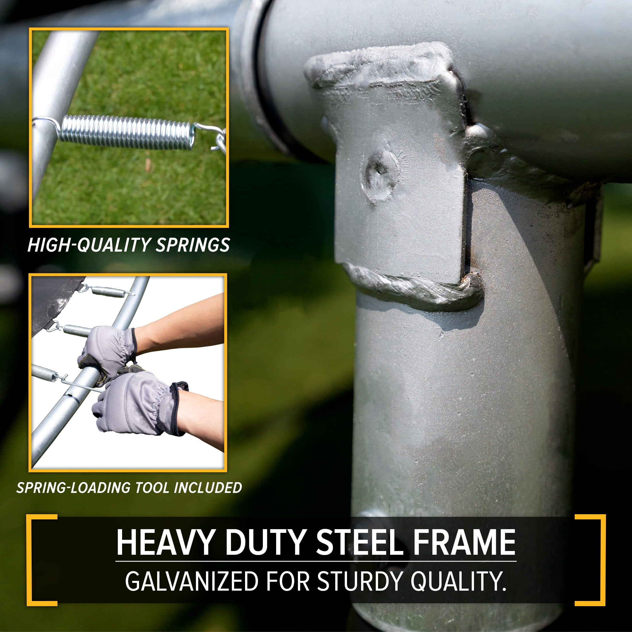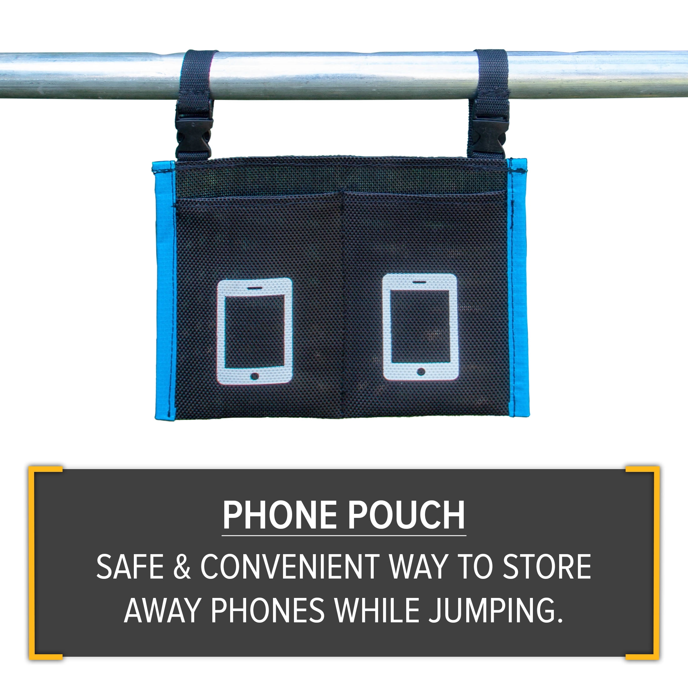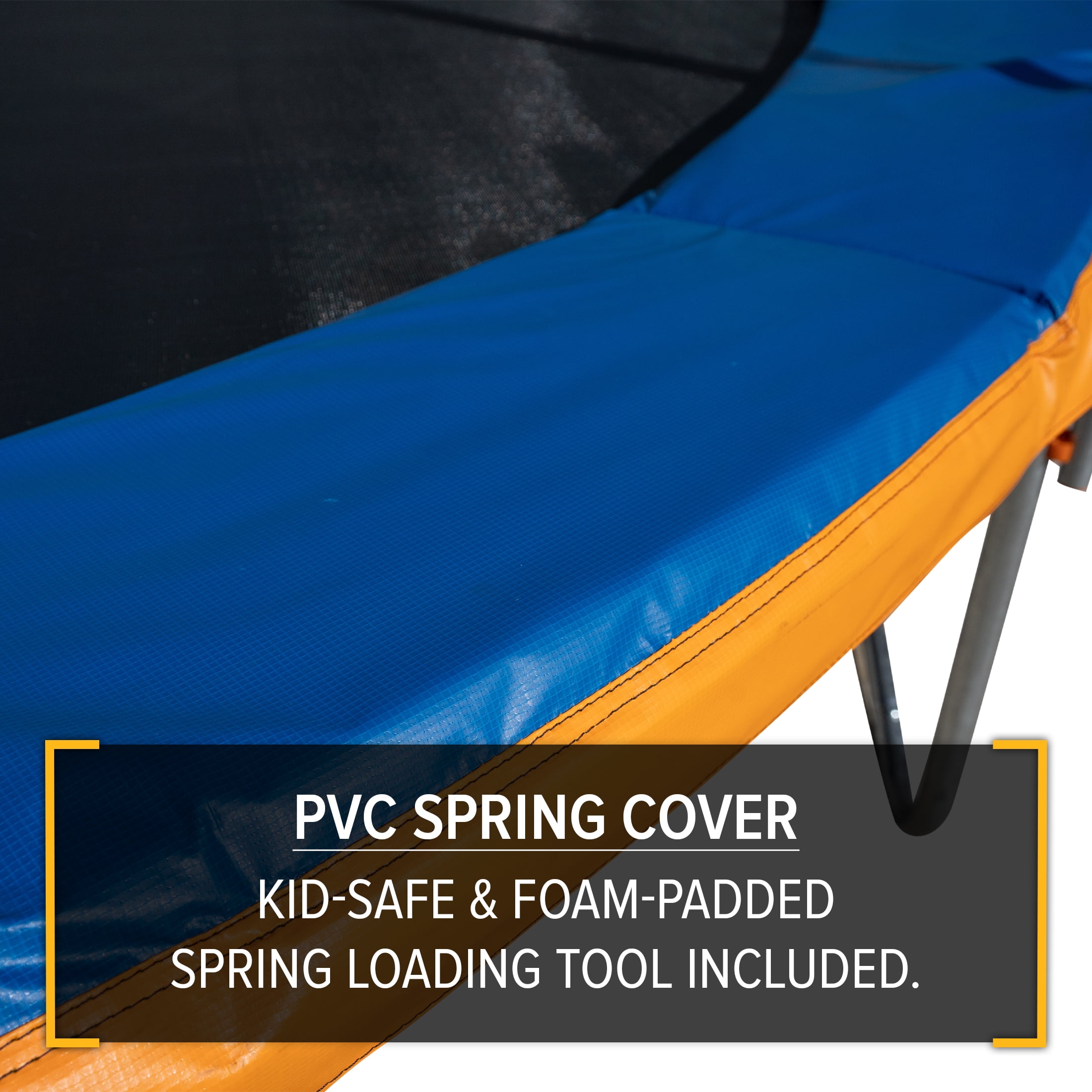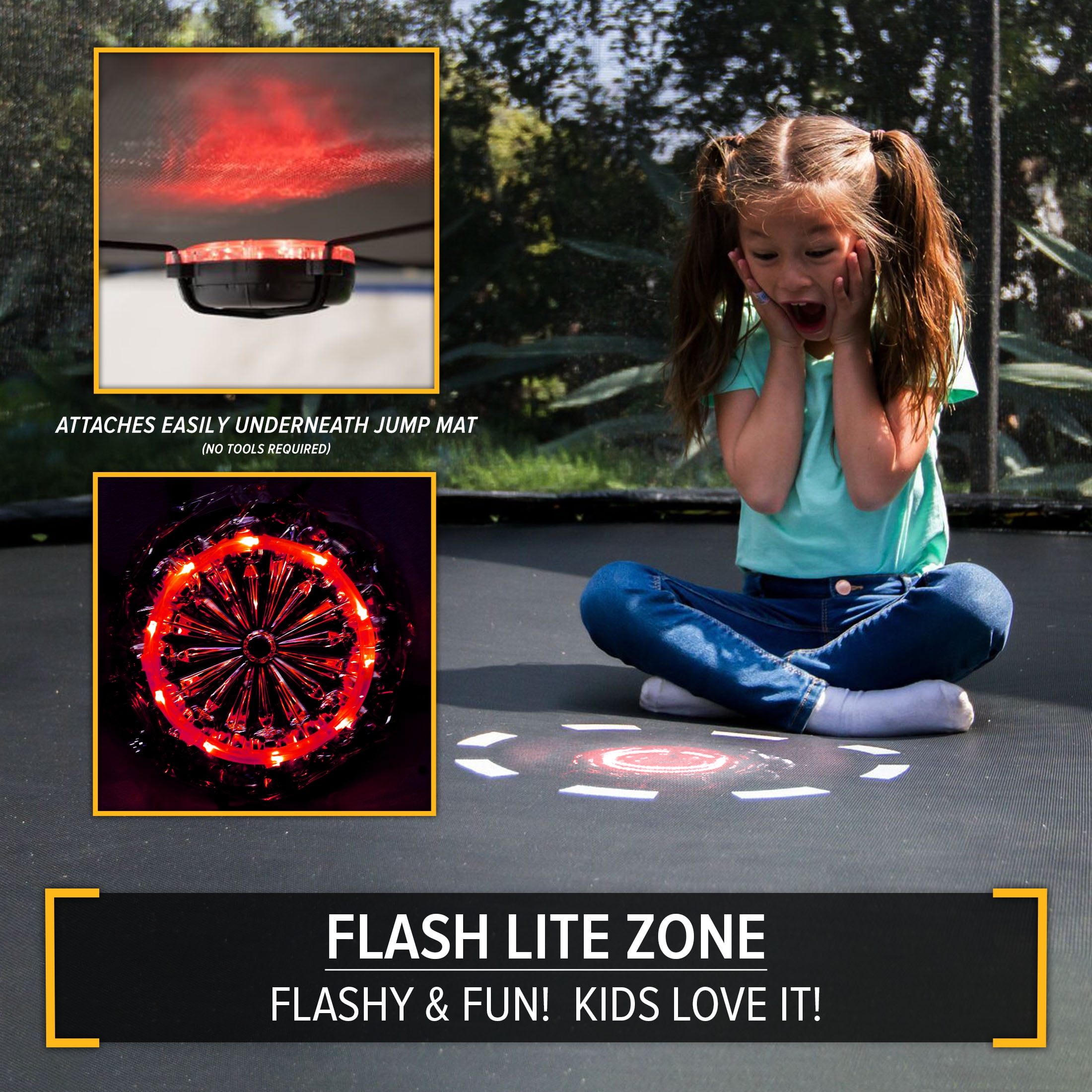 Heavy Duty, rust resistant galvanized steel frame to provide long-lasting safe play and stability High quality springs and jump mat to provide a smooth, deep bounce Jump mat and enclosure net are tested to 2x the industry UV resistance standard to ensure durability Extra features include the patented Electron Shooter Laser Game, flash light zone and a phone safety pouch Perfect for outdoor play Dimensions: 12′ diameter 9′ height