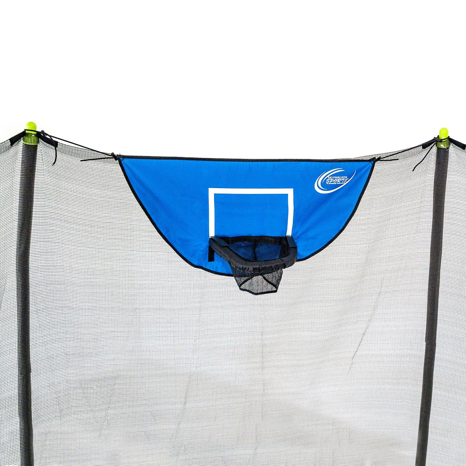 The Bounce Pro 14′ Trampoline with the patented Flash Lite Zone. Steel Flex enclosure system and Flash Light Zone is a great addition to any backyard. The frame is made of high quality galvanized steel tubes to provide durability and stability. The jump mat, spring pad protector and safety enclosure netting are UV resistant and test to over double of the ASTM standard. The long springs provide a smooth, deep bouncing action which kids love. The SteelFlex enclosure system provides extra safety and helps eliminates the sagging net problem. Bring the excitement of the court to your own backyard with the Skywalker Trampolines Basketball Game! This basketball hoop is made of soft material and easily attaches to the enclosure poles of your trampoline for an endless amount of fun. The basketball hoop features a hook-and-loop attachment, which allows it to break away when sufficient force is applied, keeping kids safe while dunking! The Skywalker Trampolines Basketball Hoop is the perfect addition to any trampoline!