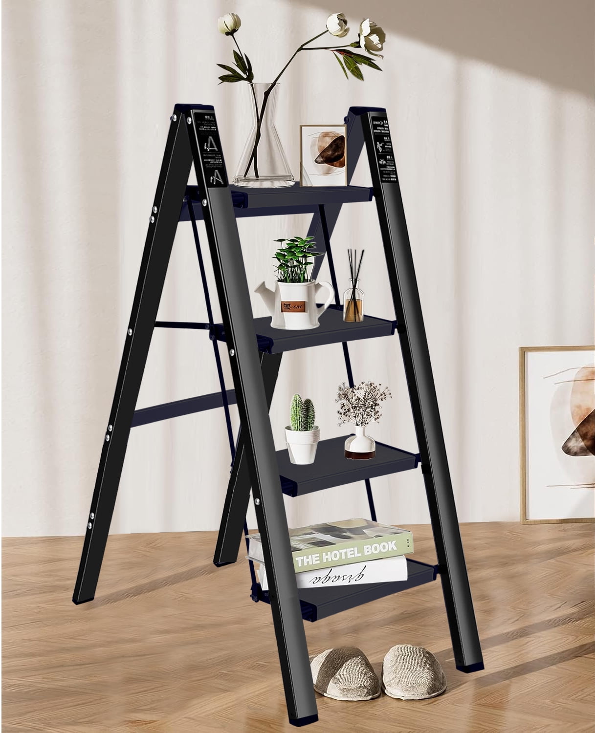 BOWEITI 4 Step Ladder, Steel Folding Step Stool with Wide Anti-Slip Pedal, Portable Lightweight Multi-Use Stepladder 330lbs (Black)