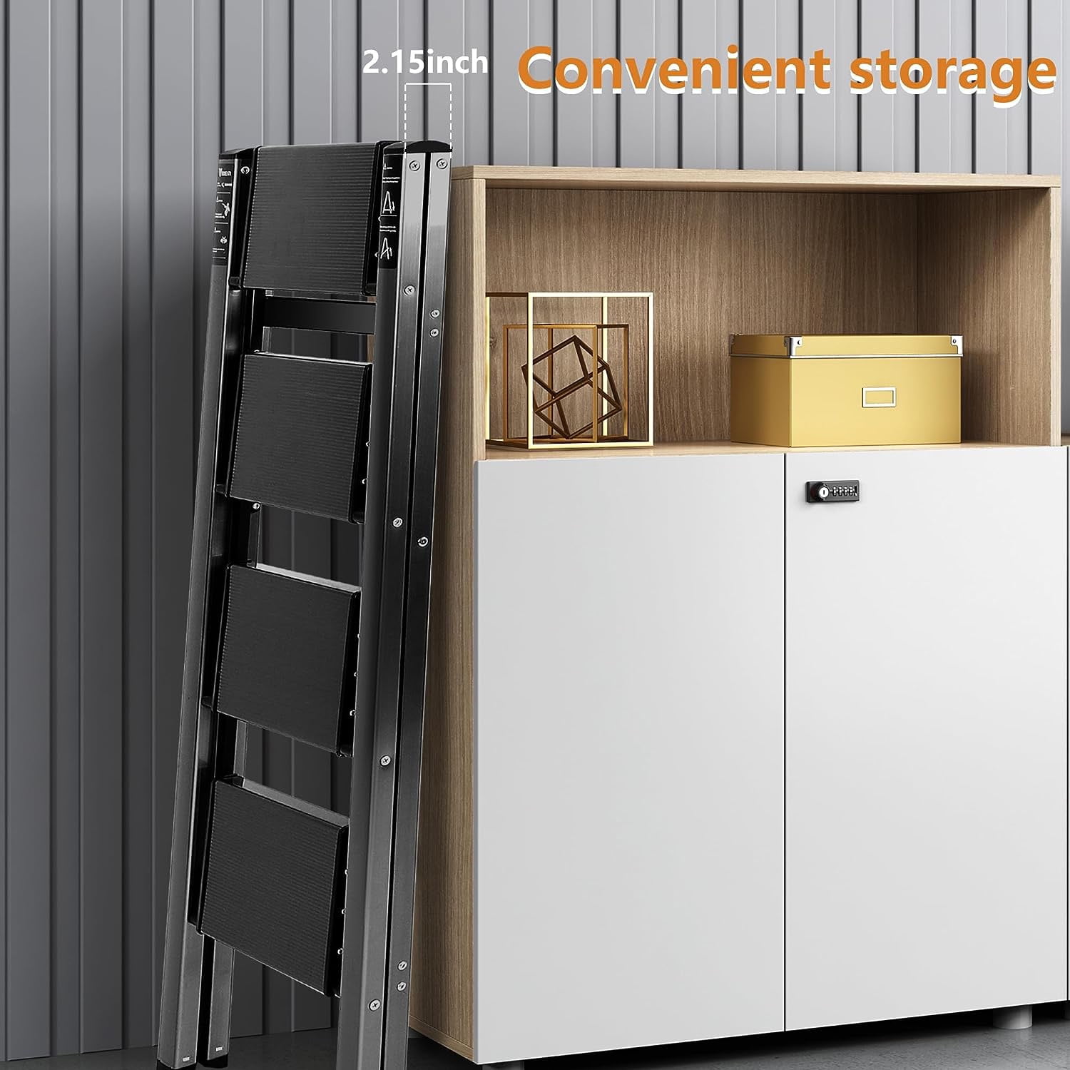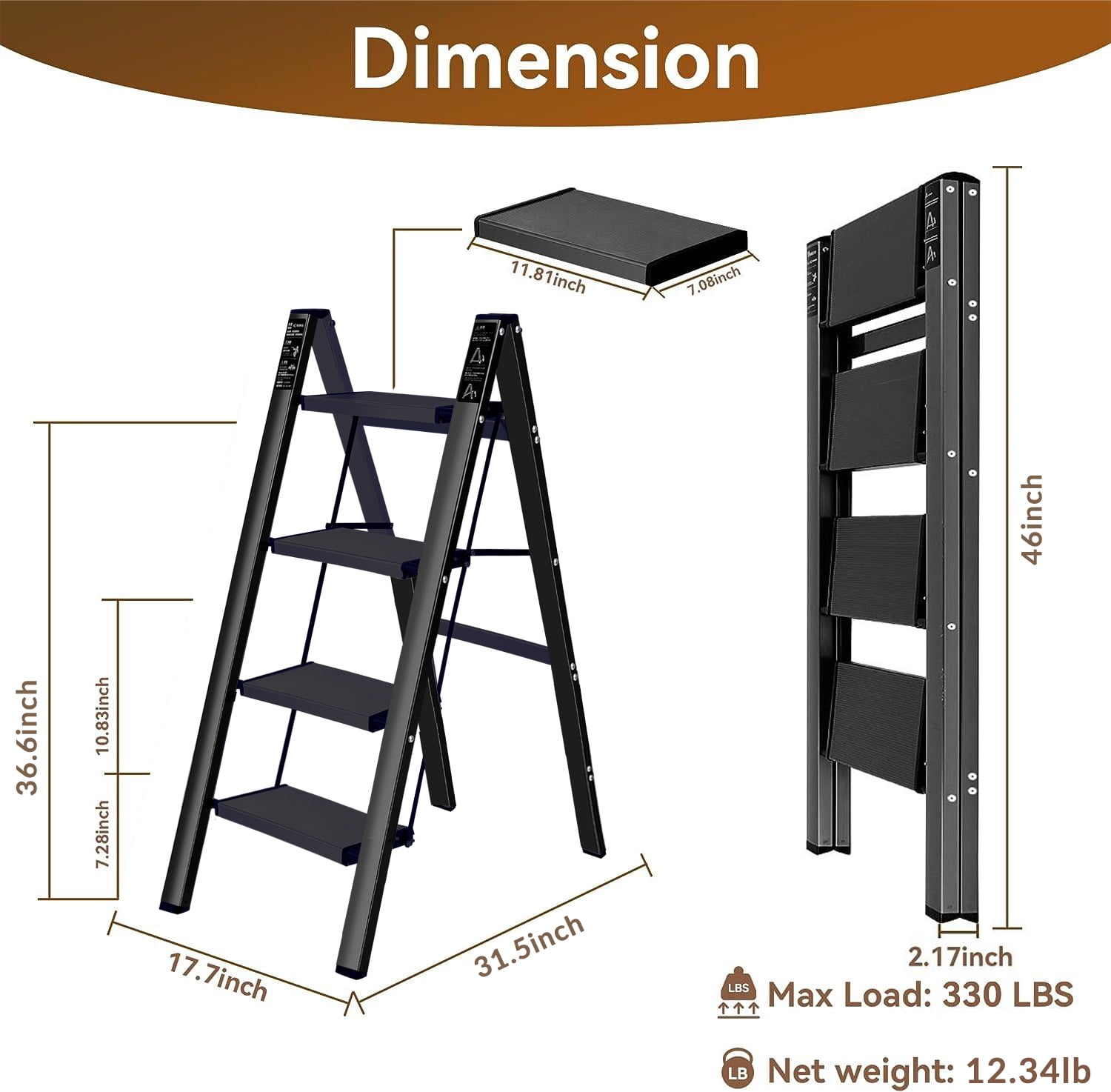 Lightweight Compact Ladder – Fold thin to 2.1 inches. Easy to store behind a door, under sofas, in the closet, and accessible for use.Sturdy Aluminum Step Ladder – Made of aircraft-grade aluminum, the ladder is lighter and the weight capacity is up to 330 pounds. The embedded beams between the frame ensure that the ladder will not shake and triangular structure support is stable when you climb the ladder.Non-slip Treads and Feet – Your feet are relaxed when stepping on the rungs. The rubber feet are also anti-slip processed, suitable for kinds of floors, and prevent scratches.Free of Installation – Comes fully assembled. Quickly open and fold in secs. Easy to climb as going up the stairs. You can easily reach the high place now.