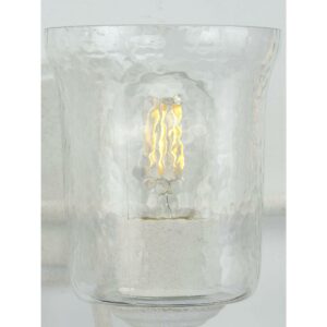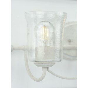 Beautiful lighting will appeal to both your classic taste and your artistic spirit with this bath light. Wandering eyes will focus on clear chiseled glass shades as they offer an air of refinery. Handsome cottage white light bases are supported by dainty curved arms to complete the elegant design.