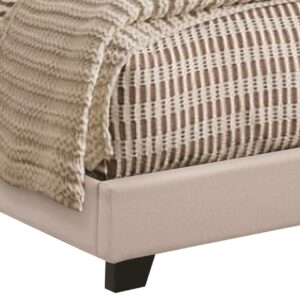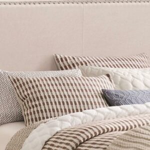 Embrace a relaxed modern style with the smooth edges from this upholstered bed frame. Complete with solid wood legs in a black finish, the open frame warms up spaces with simplicity. Chic and individually placed, the chrome nailhead trim adds pops of metallic radiance along the fabric-covered headboard. Constructed of smooth rectangles, the open silhouette feels calm and welcoming. Neutral and soft hues ensure that traditional and contemporary design schemes are maintained.