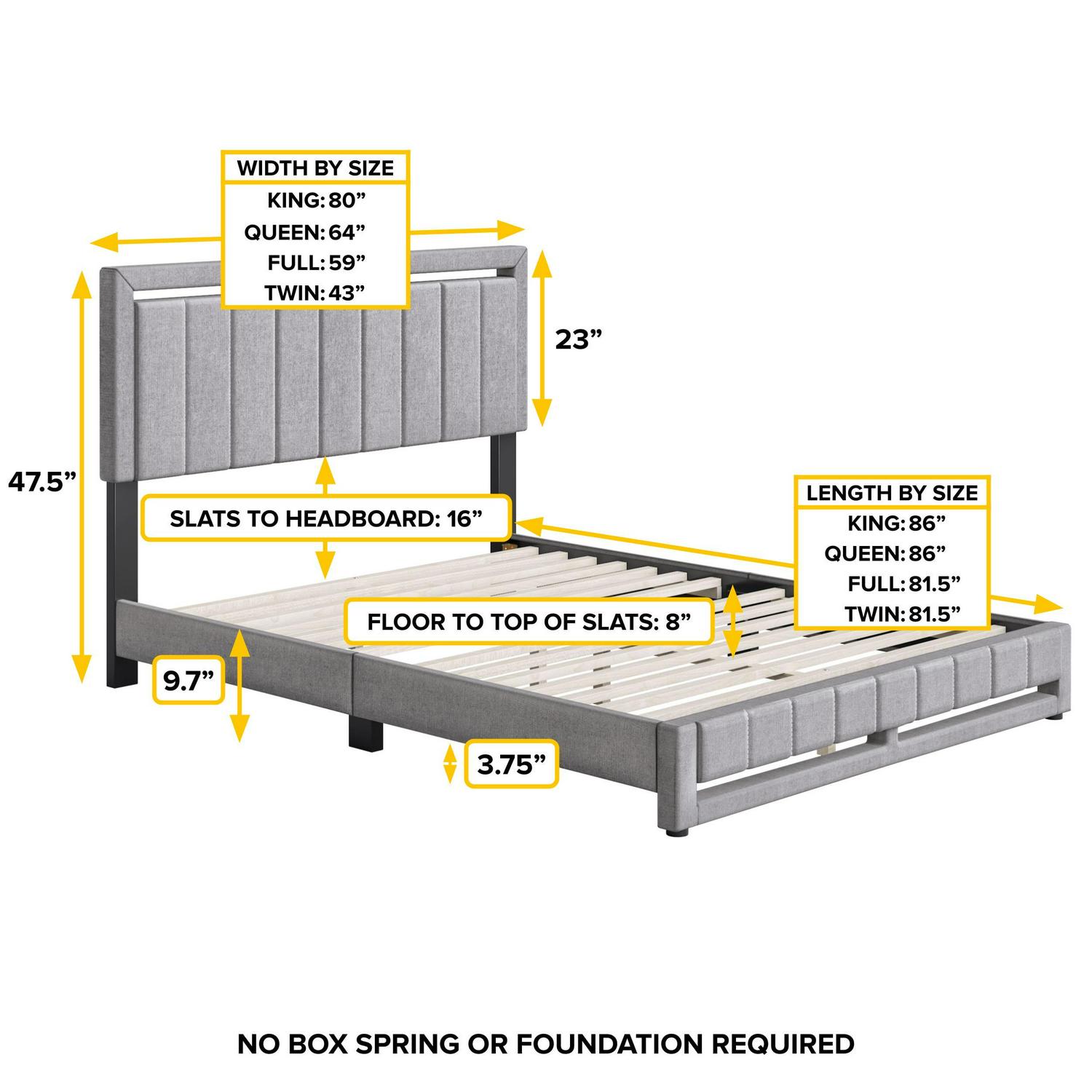 – Assembled Size:King 86″L x 80.3″W x 47.5″H; Queen 86″L x 64″W x 47.5″H; Full 81.5″L x 58.6″W x 47.5″H; Twin 81.5″L x 42.9″W x 47.5″H.