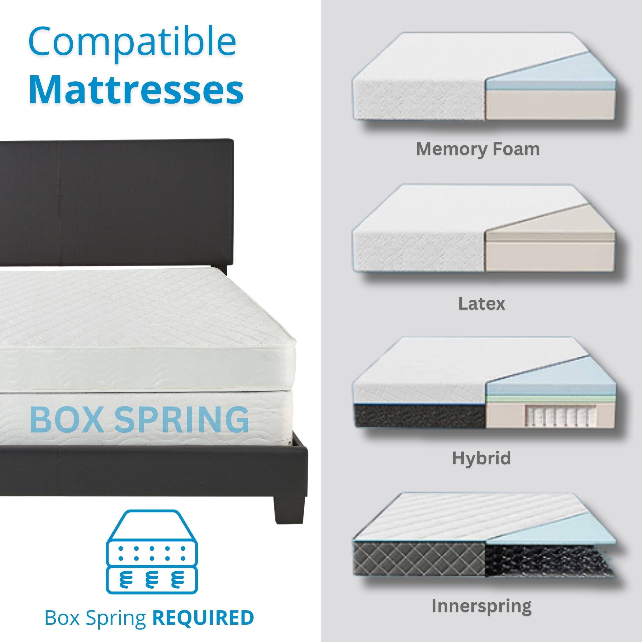 Modern upholstered padded bed from Boyd Sleep Requires a box spring or foundation Sturdy wood and metal frame construction with extra center support legs All components ship zipped in the headboard for easy handling Easy 15 minute assembly Philips screwdriver required Frame supports up to 700 lbs. Available in 5 colors of faux leather Twin, Full, Queen, and King sizes Assembled Size: King: 46″ H x 78″ W x 83.75″ L, 70 lbs, Queen: 46″ H x 62″ W x 83.75″ L, 60 lbs, Full: 46″ H x 56″ W x 78.75″ L, 56 lbs, Twin: 46″ H x 41″ W x 78.75″ L, 50 lbs. Box Dimensions: King: 4″ H x 25.2″ W x 82.5″ L, 77 lbs, Queen: 4″ H x 25.2″ W x 66.5″ L, 66 lbs, Full: 4″ H x 25.2″ W x 61″ L, 62 lbs, Twin: 4″ H x 25.2″ W x 45 ” L, 44 lbs. Site to Store: This item is packaged in a large box that may not fit in a standard-sized vehicle. Please make sure you have a large car or truck for store pickup.
