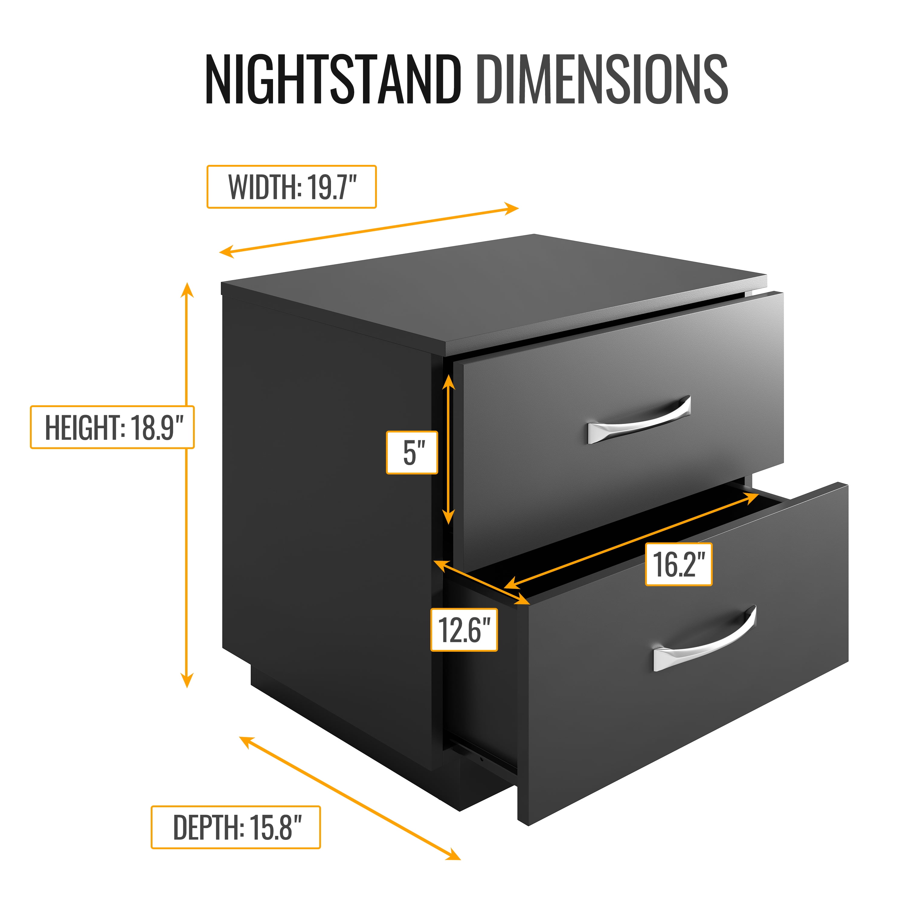 Modern 2-Drawer Nightstand – The Boyd Sleep Hamilton Nightstand combines modern aesthetics with a practical dual drawer design, making it a perfect addition to your bedroom decor. This bedside table’s two spacious drawers provide ample storage space for reading, electronics, bedding, etc. The easy-glide mechanism ensures smooth open and close, helping you keep your bedroom organized and clutter-free. Its sleek design elevates your space while giving you practical storage. Space-Saving & Economical – Measuring 19.69″ W x 15.75″ D x 18.9″ H, this laminate wood nightstand offers practical storage solutions without taking up too much floor space. Its two-drawer design allows for efficient organization, making it a perfect choice for smaller bedrooms, apartments, dorm rooms, or limited spaces. Maximize your storage potential in small spaces with this modern 2-drawer side table. Versatile & Multifunctional – This nightstand isn’t limited to just bedside use. Its compact size and versatile design make it an ideal choice for use as a side table or end table in any room. Place it in your living room or home office to add a touch of modern style and provide extra storage space. The Boyd Sleep Hamilton Nightstand provides a sleek and contemporary accent next to your sofa, armchair, couch, or desk. Solid & Durable – Crafted from high-quality hardwood MDF with a wipe-clean laminate finish, this modern nightstand is built to last. Its sturdy construction ensures long-lasting durability and stability, providing you with a reliable piece of furniture that will withstand daily use. Glossy silver drawer pulls resist daily wear and tear while adding a luxurious accent. Pedestal base provides stability and prevents wobbling or tipping. Easy 30 Minute Assembly – With clear instructions and all necessary hardware included, assembling this nightstand is a breeze. Spend less time on complicated assembly and more time enjoying the style and organization it brings to your space. Philips screwdriver required (not included).