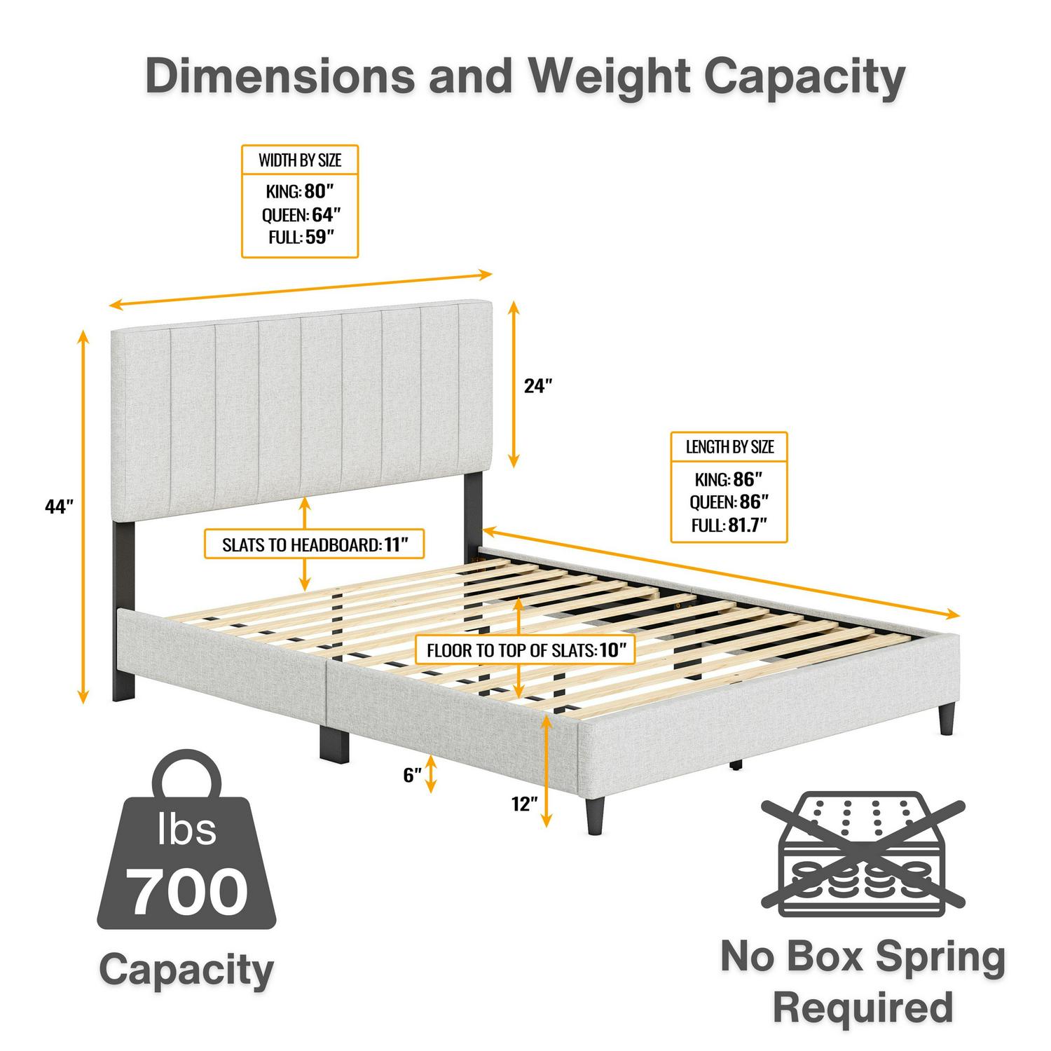 – Assembled Size: King – 80.3″W x 86″L x 44″H; Queen – 64.1″W x 86″L x 44″H; Full – 58.6″W x 81.7″L x 44″H