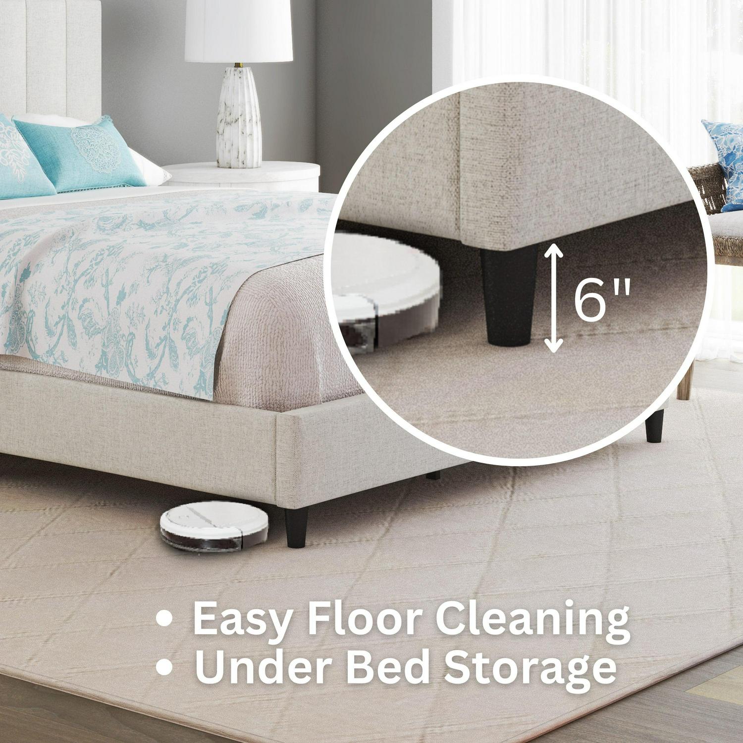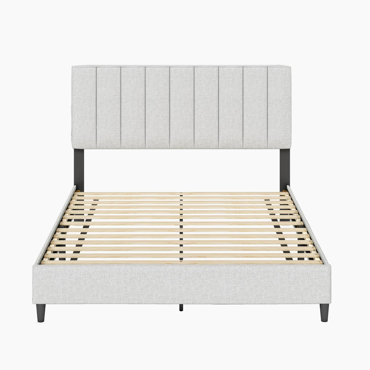 - Modern linen platform bed with upholstered headboard